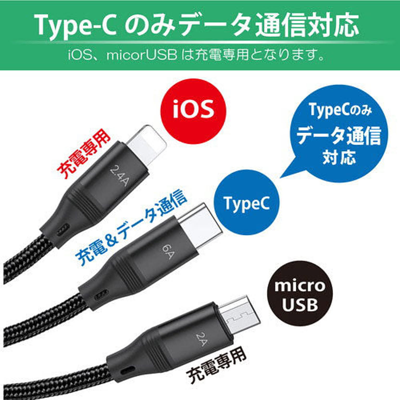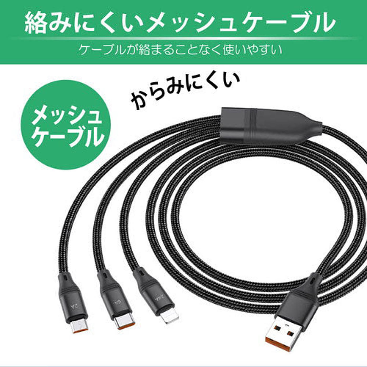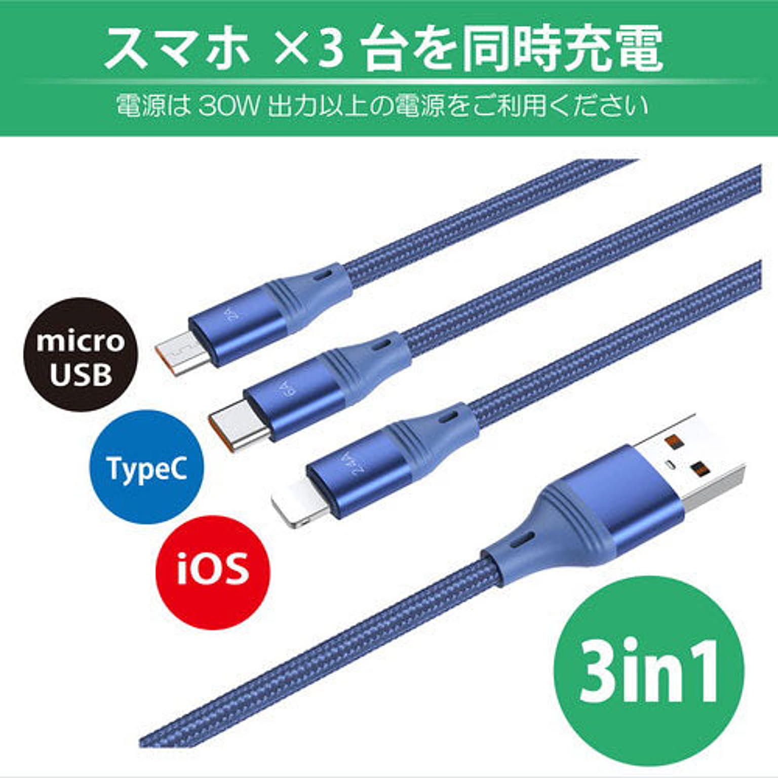 iOS/Type-C/microUSB端子の3台の機器を同時に充電できるケーブルUSB(A)充電器から iOS / Type-C / microUSB端子を搭載した3台の機器を同時に充電できる3つ又ケーブルです。