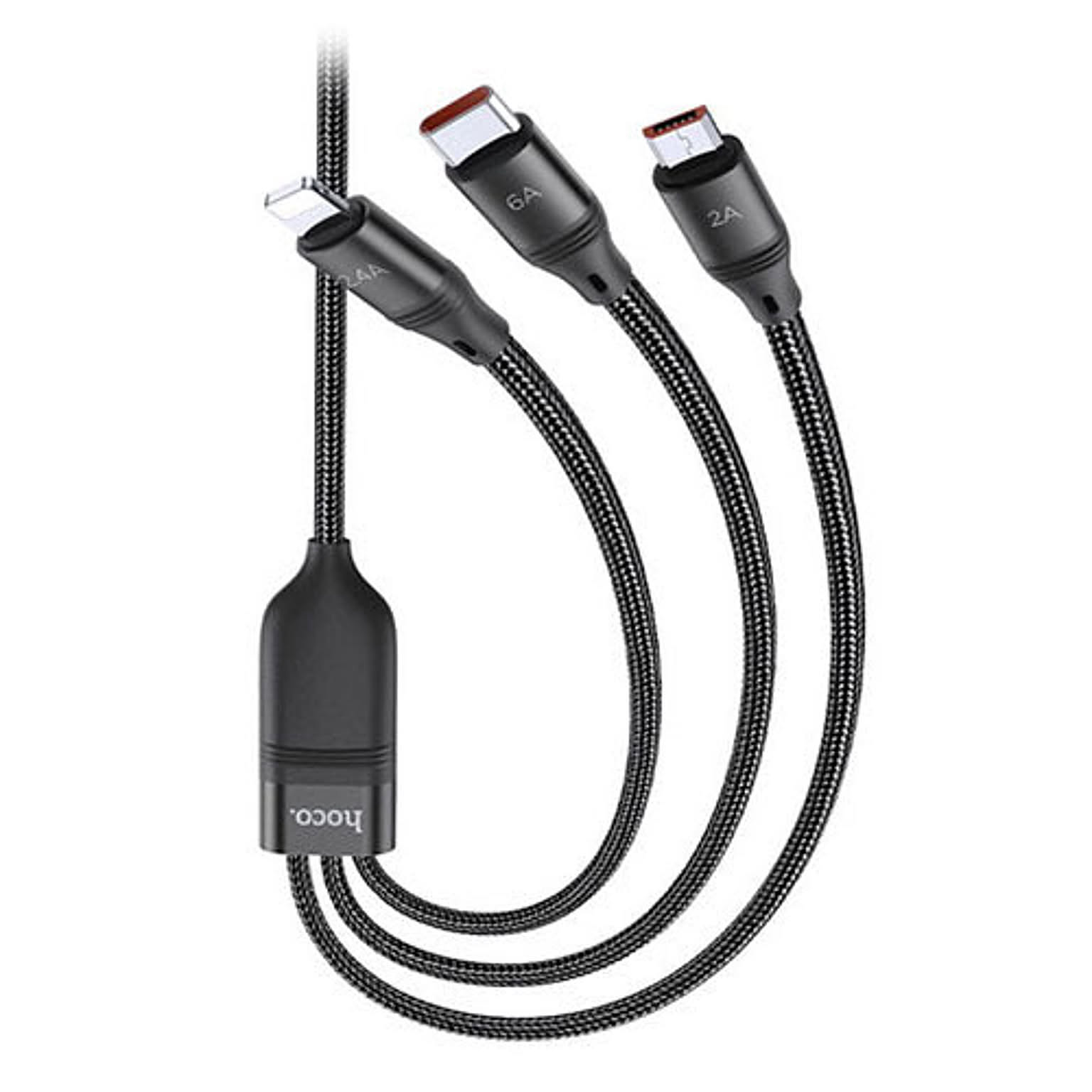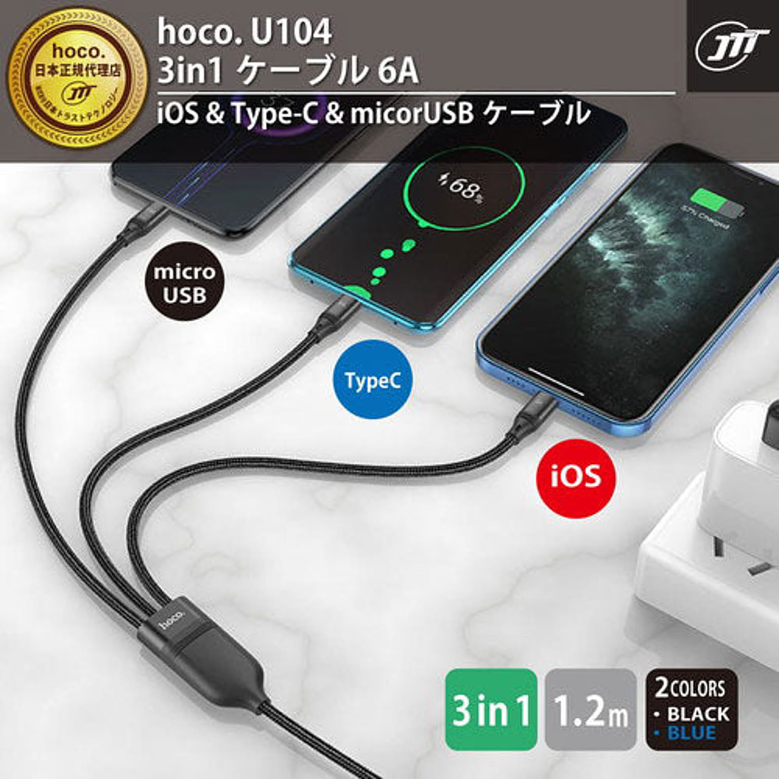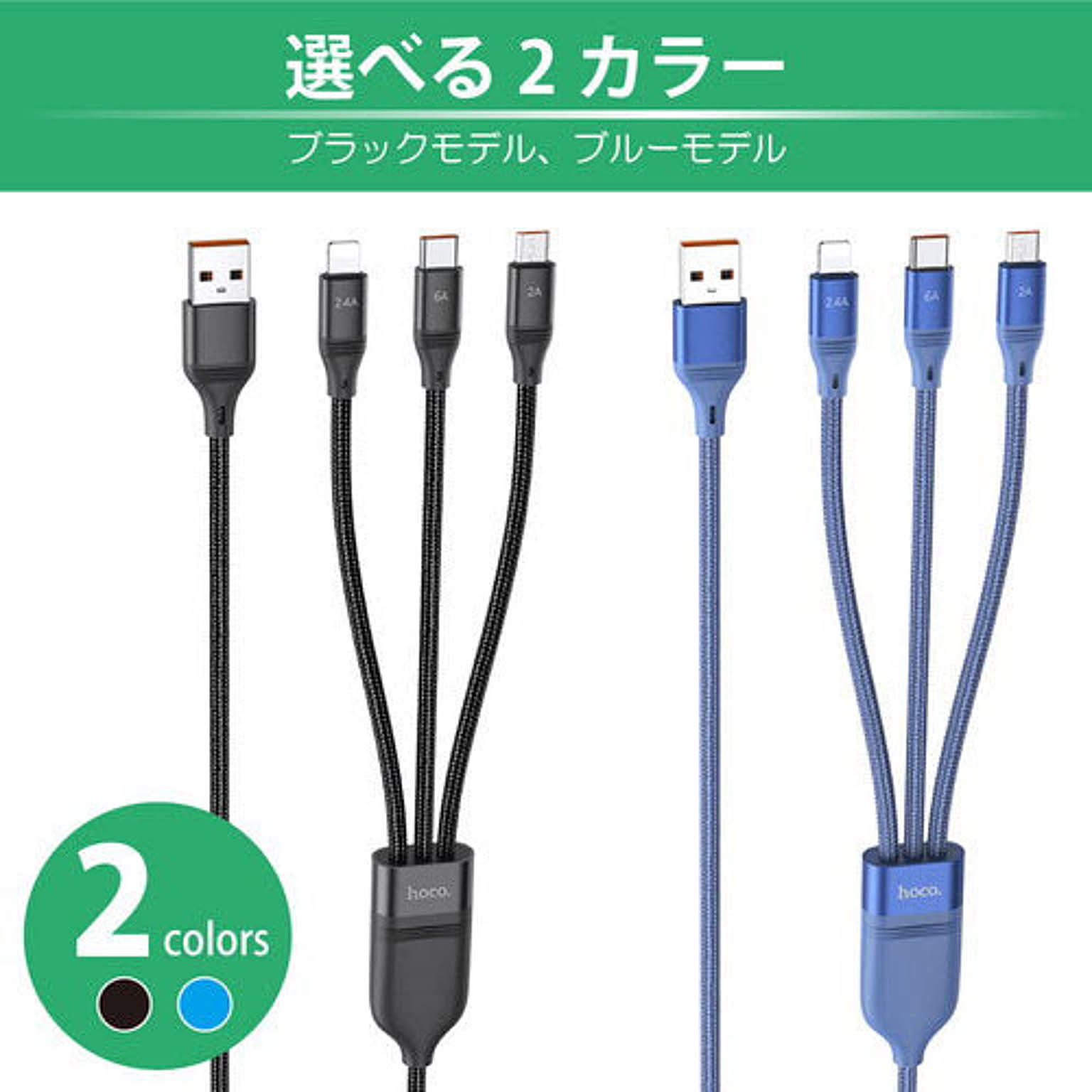 iOS/Type-C/microUSB端子の3台の機器を同時に充電できるケーブルUSB(A)充電器から iOS / Type-C / microUSB端子を搭載した3台の機器を同時に充電できる3つ又ケーブルです。