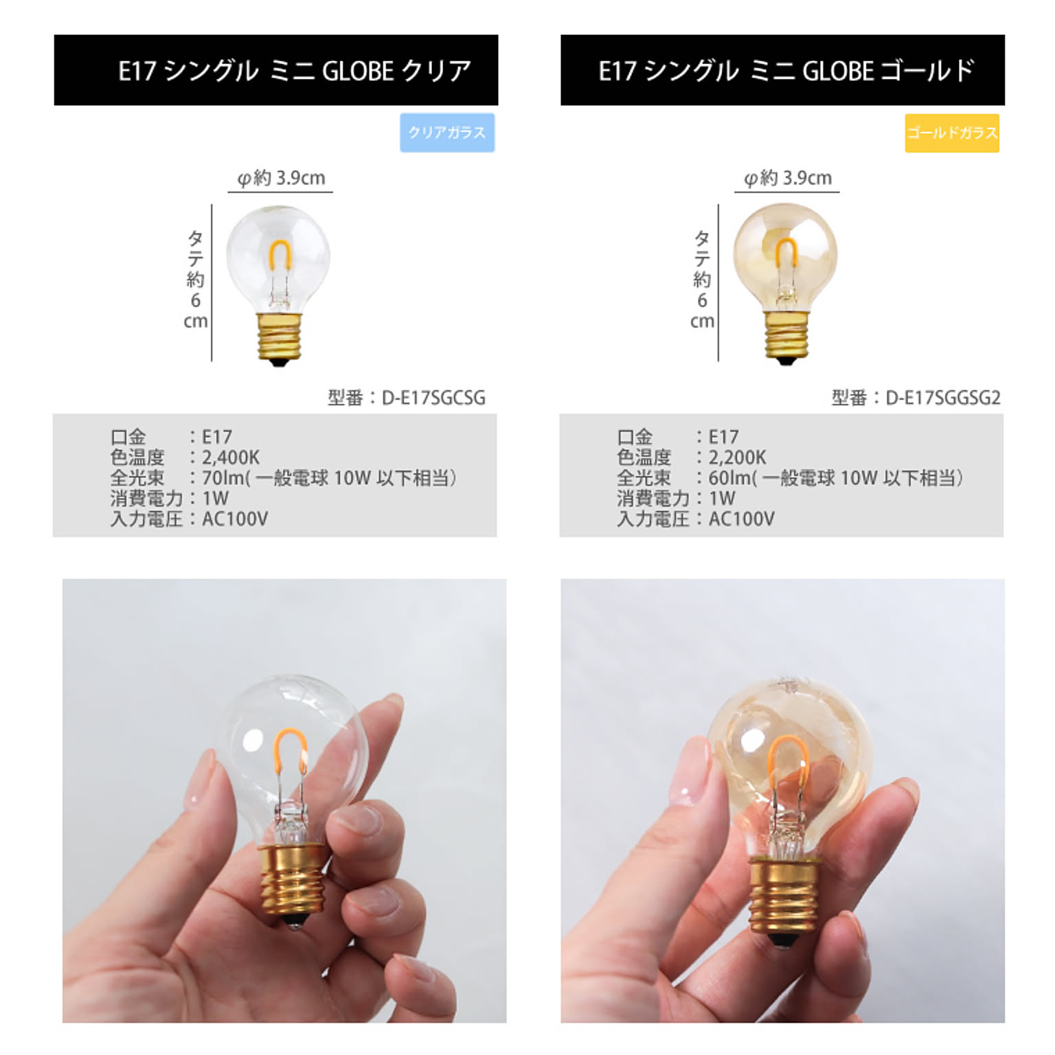 | 仕様 | 電球の種類:LED 定格消費電力:1W 定格電圧:AC100/110V 50/60HZ 全光束:60-70lm(一般電球10W相当) 口径:E26・E17 色温度:クリアガラス2400K(電球色)、ゴールドガラス2200K(濃い電球色) |