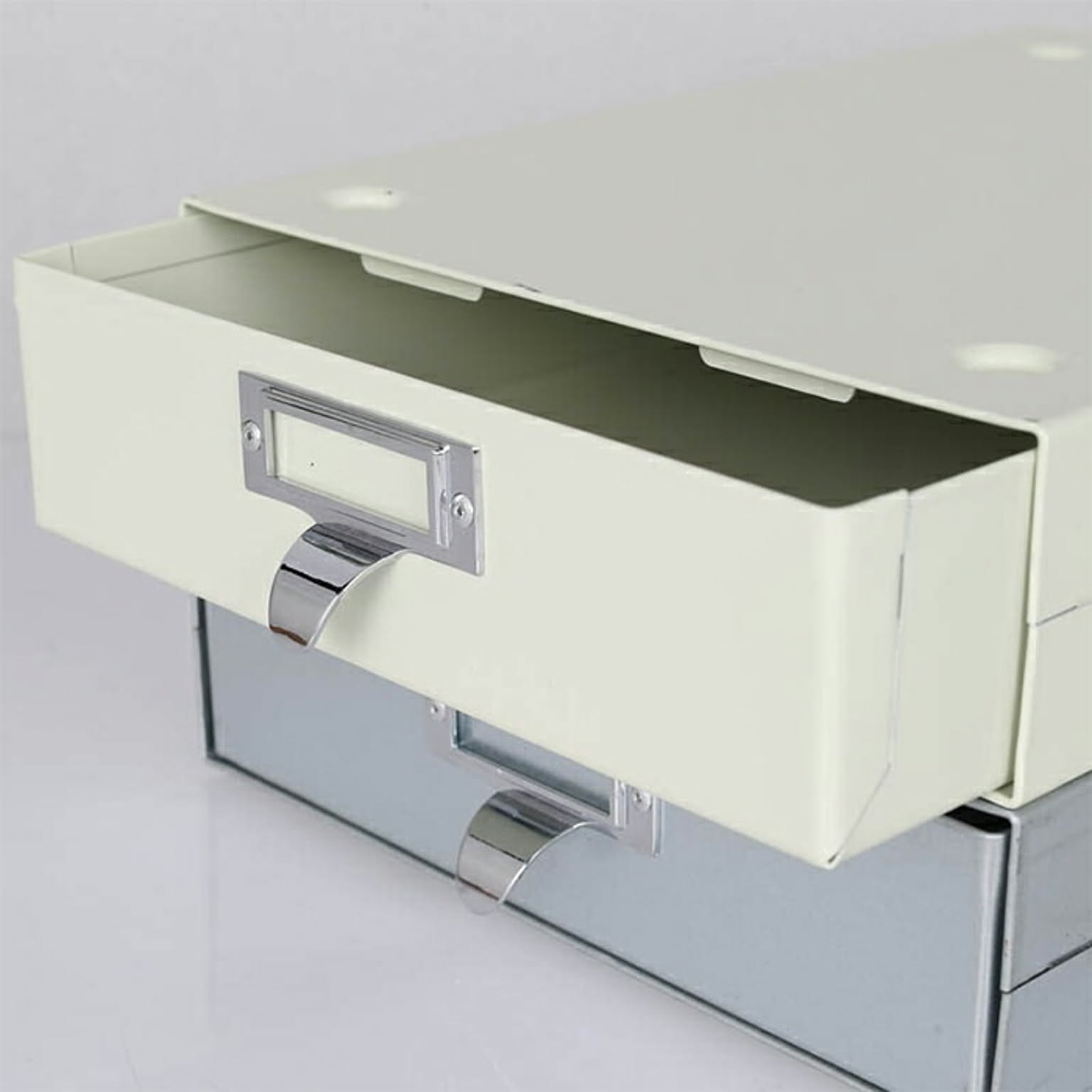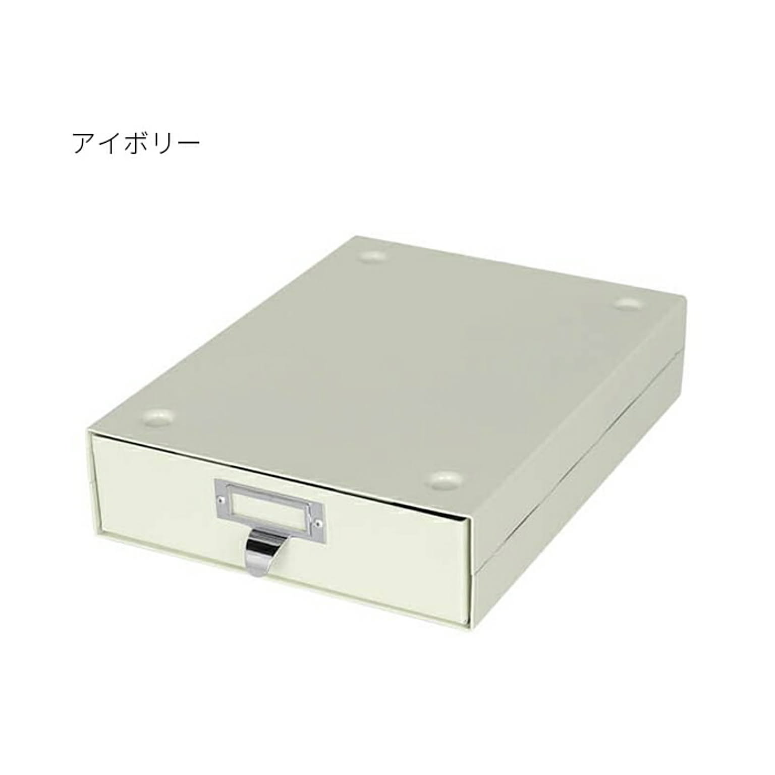 どっしりとした重量感のあるスチール製卓上ドロワー。引き出しの落下を防ぐストッパー、スタッキング時の安定を保つ凹凸や背面の固定用フックなど、卓上ドロワーを使う際に起こり得るストレスを軽減。ごくシンプルな構造ゆえに、背面のエンボスロゴや取手のカードホルダーなど、細部へのこだわりが惹き立ちます。A4サイズの書類などを縦向きに収納できます。