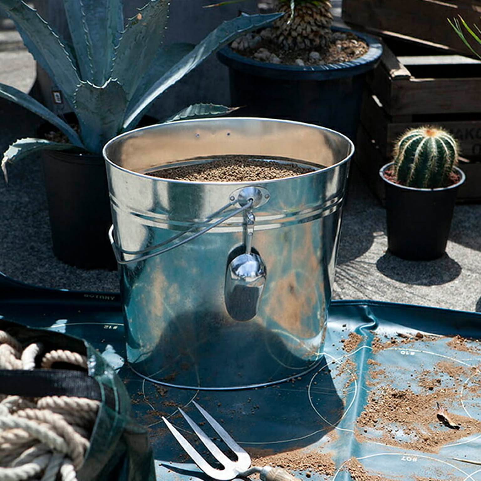 用土をブレンドしたり、植物の植え替えをする時に重宝するバケツ。ガルバナイズド仕上げならではの無骨さに思わず目を奪われます。土を直接バケツに入れてガシガシ使うのはもちろん、オーバル型なので、購入した用土を袋ごとストックすることも可能。バケツ側面の引っ掛け用フックには、付属のスコップを掛けて保管できます。楽しい植え替えの時間にバケツや袋を倒して土をこぼしてしまう。蓋を敢えて開きにくい仕様にすることで、万一倒してしまっても、楽しい時間を遮られることなく過ごしていただけます。