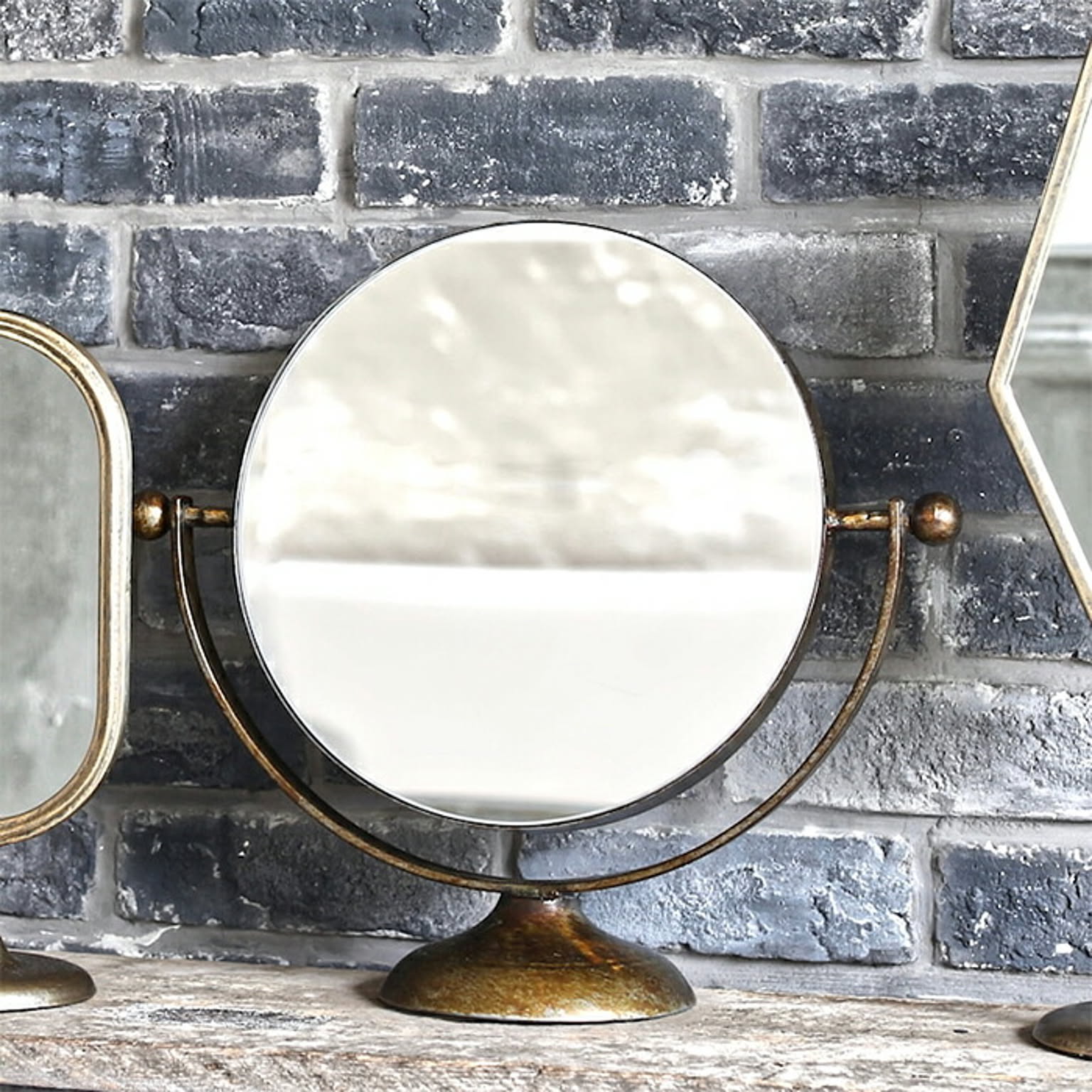 気品ある佇まいの中に重厚感も感じられるアンティーク調の卓上ミラー。個性的な形状はインテリアとして存在感を放ちます。