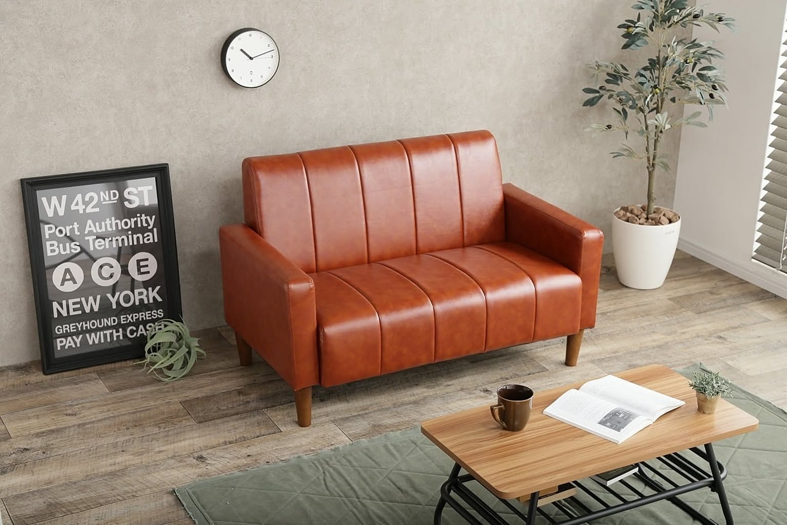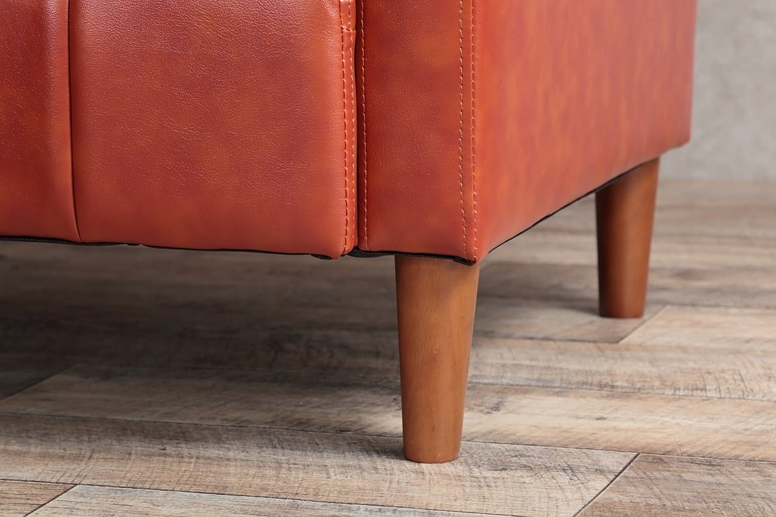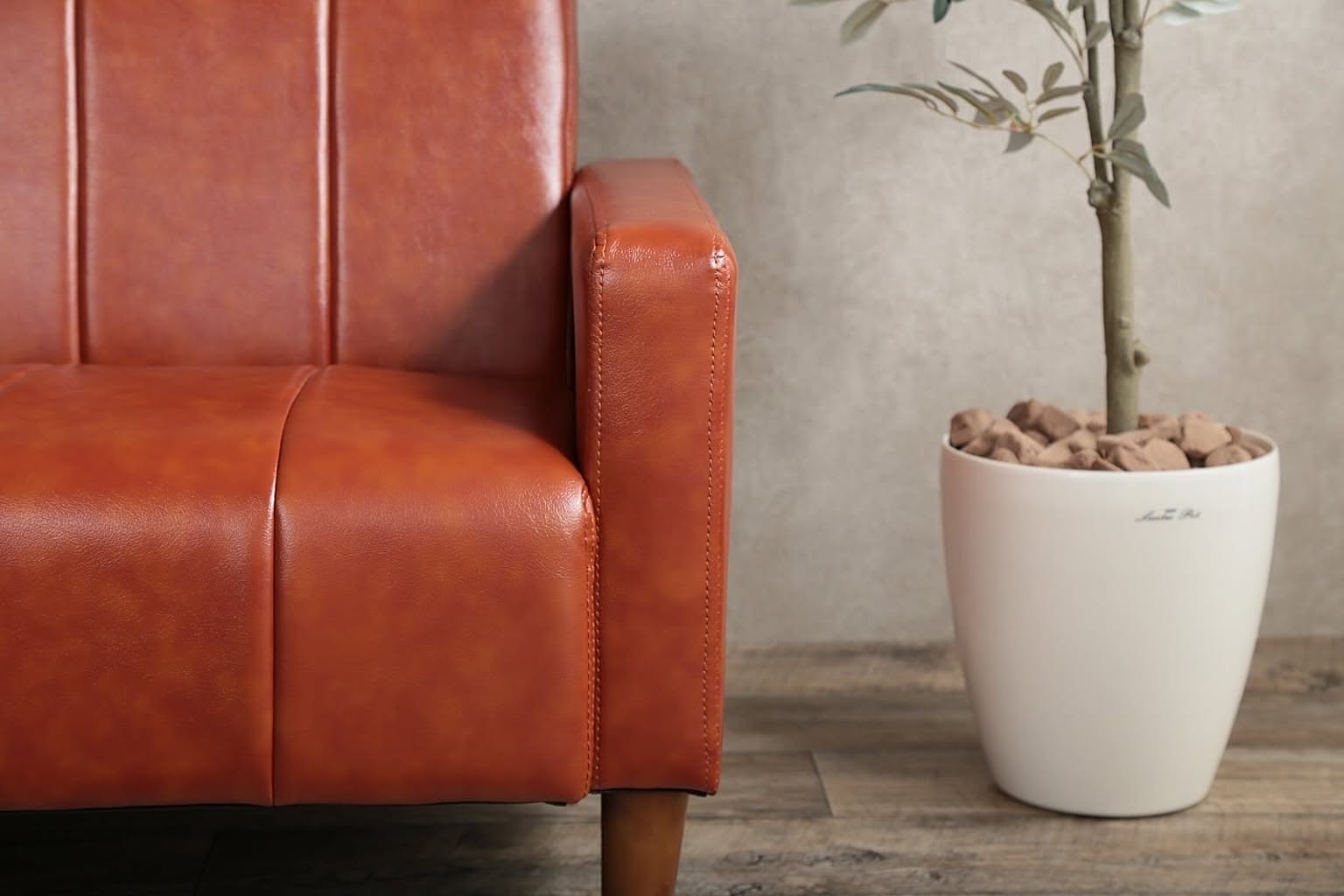 どこか懐かしさが感じられるヴィンテージ調ソファ。本革のようなキャラメルブラウンのPVCレザーにストライプステッチがアクセントになって、シンプルながら印象的な佇まいです。ヴィンテージスタイル好きの方にオススメの2人掛けソファです。
