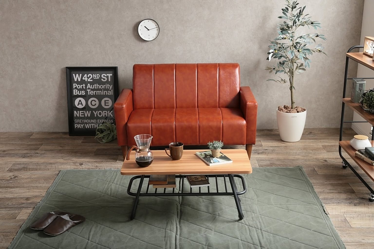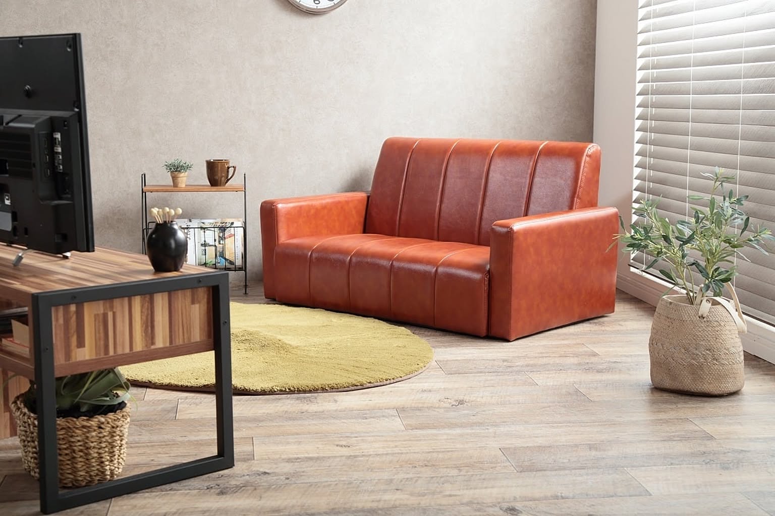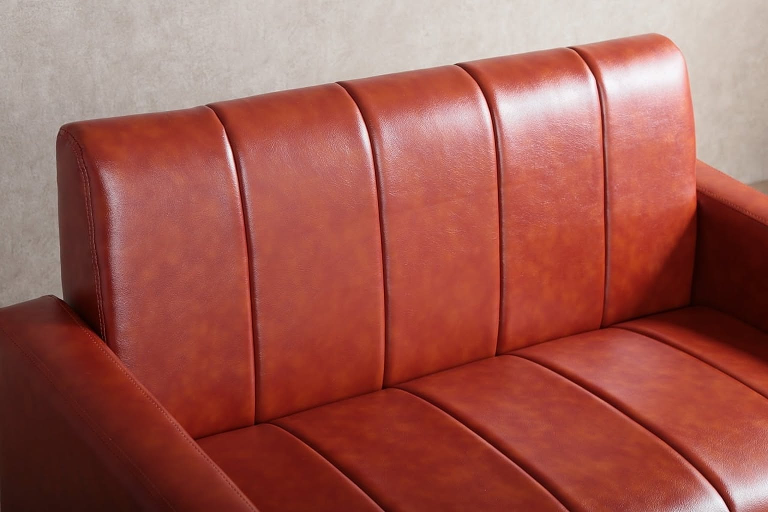 どこか懐かしさが感じられるヴィンテージ調ソファ。本革のようなキャラメルブラウンのPVCレザーにストライプステッチがアクセントになって、シンプルながら印象的な佇まいです。ヴィンテージスタイル好きの方にオススメの2人掛けソファです。