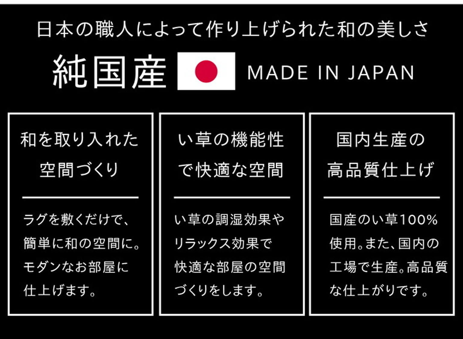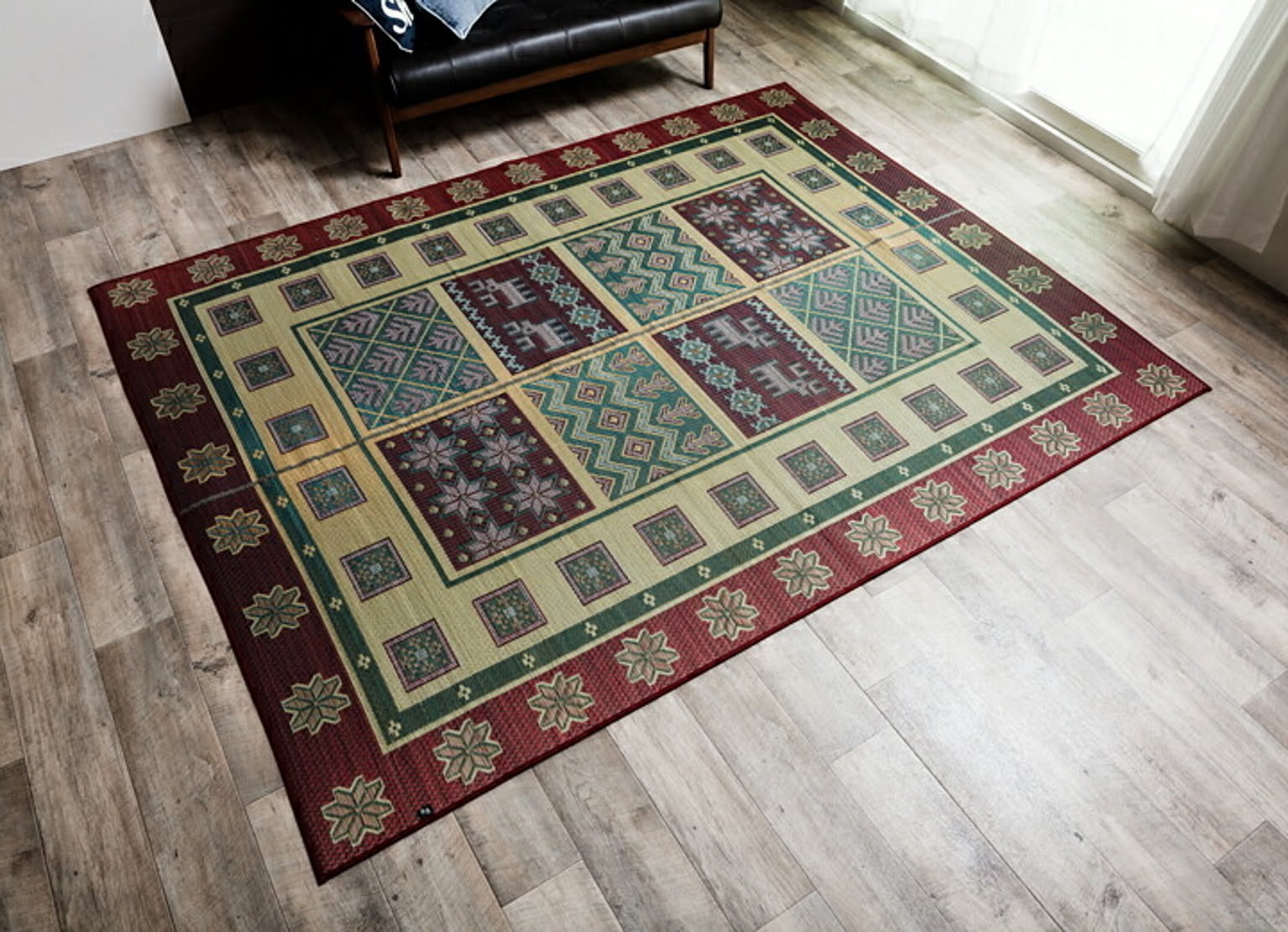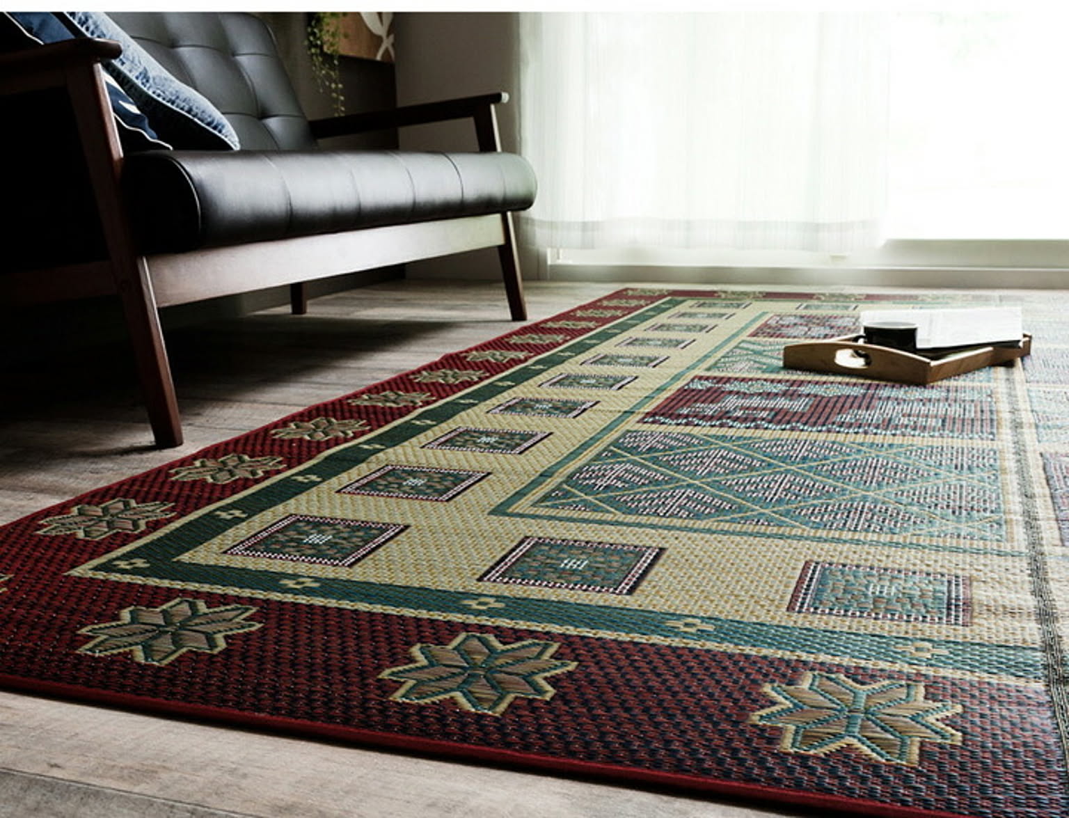 い草カーペットです。国産(九州産)のい草を使用しています。一本一本が太く、表皮が厚く繊維がキメ細かいので弾力性があり、耐久性に優れています。い草には空気の自然浄化作用、湿度の調節作用などがあります。また汚れにくく、使用するうちに黄金色に変化し味が出ます。裏にはウレタンを貼っていますのでフローリングでのご使用にも適しています。い草に青森ヒバ加工を施しています。(抗菌、防臭効果)