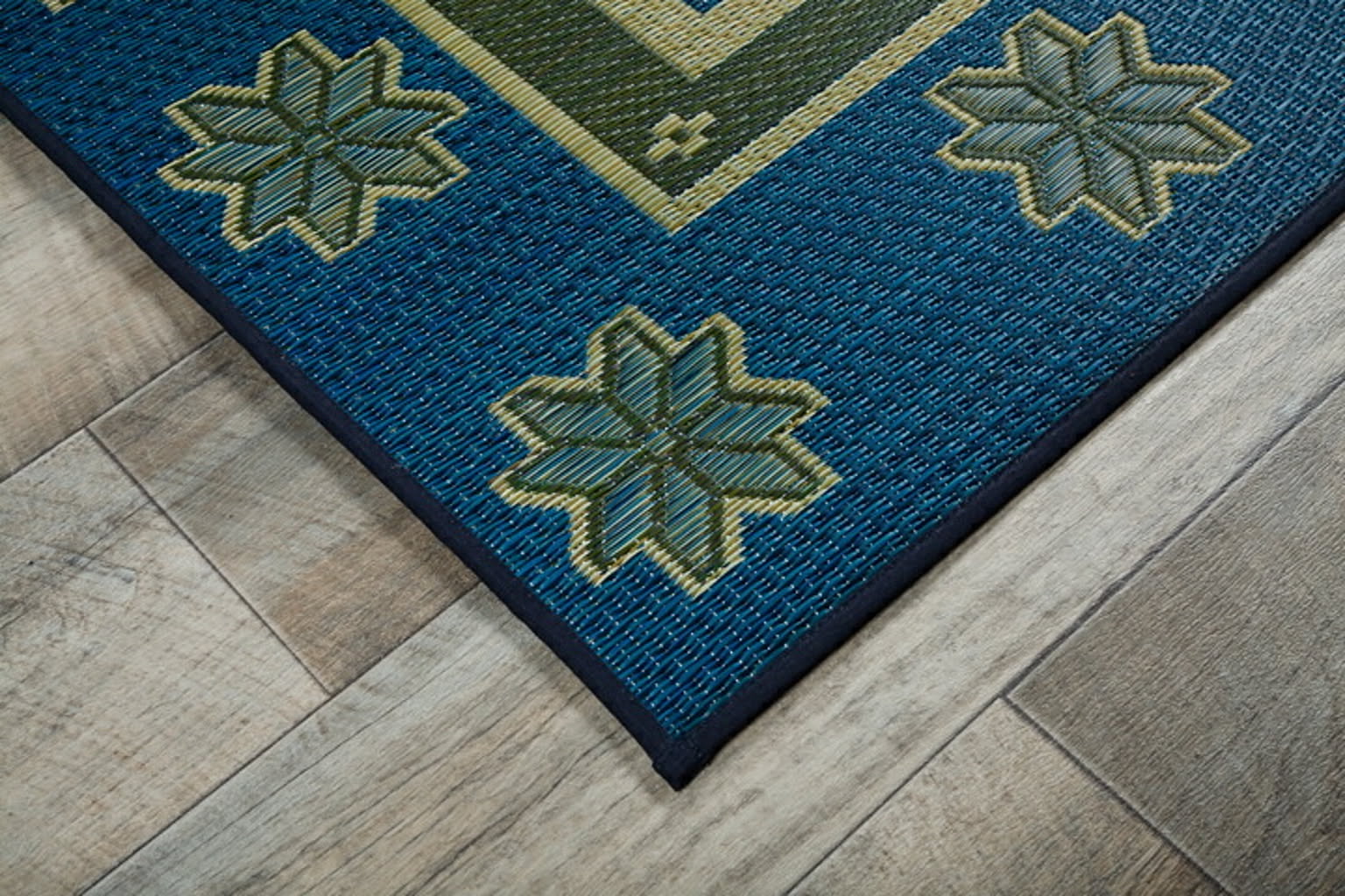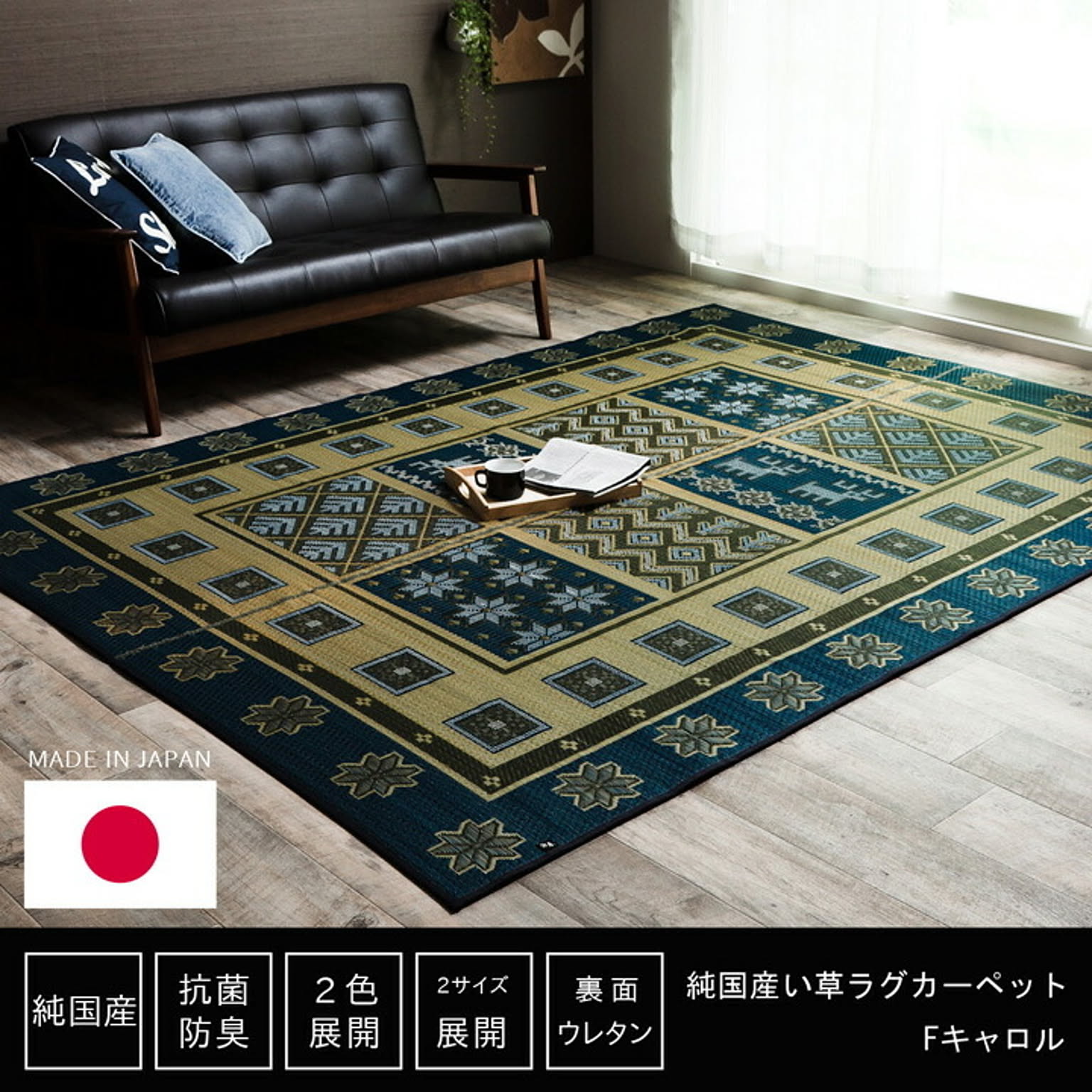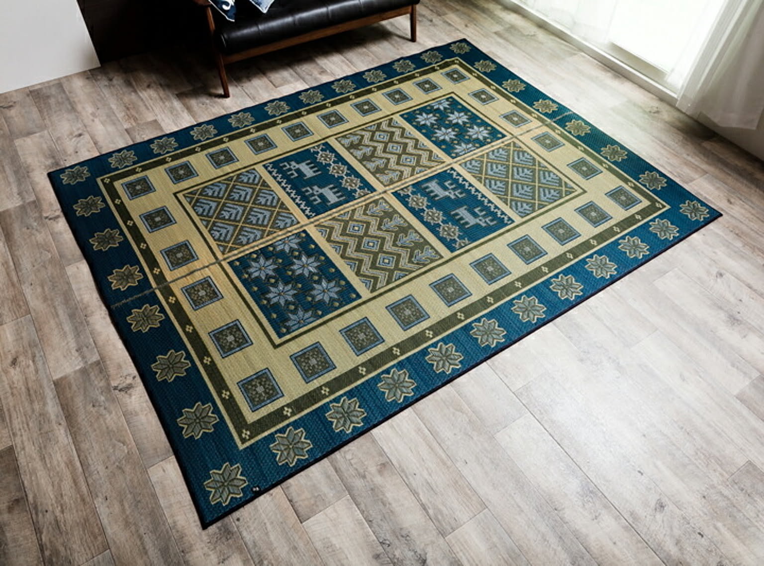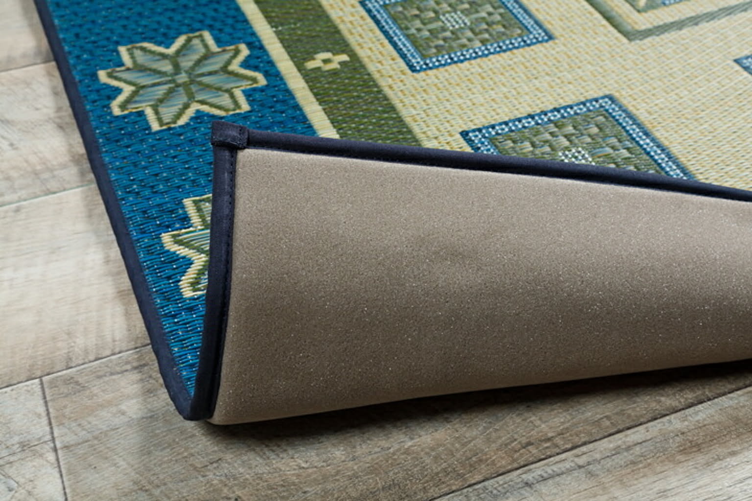 い草カーペットです。国産(九州産)のい草を使用しています。一本一本が太く、表皮が厚く繊維がキメ細かいので弾力性があり、耐久性に優れています。い草には空気の自然浄化作用、湿度の調節作用などがあります。また汚れにくく、使用するうちに黄金色に変化し味が出ます。裏にはウレタンを貼っていますのでフローリングでのご使用にも適しています。い草に青森ヒバ加工を施しています。(抗菌、防臭効果)