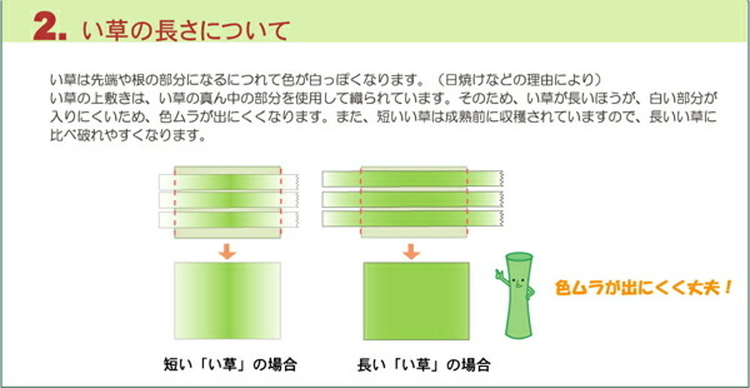 上敷きを敷くだけで畳のお部屋をリフレッシュ出来ます。日焼けしてしまった畳のリフレッシュに、新品の畳を汚さないためのカバーにご使用下さい。長さ105〜110cmの国産(九州産)い草を使用しています。そのうち約88cmを使用しています。ヘリ際はある程度白みを帯びます。(日焼けではありません、い草の根元と先端部分の色です。)い草は長いものほど高級になります。い草は先端部分が赤茶色く、根元が白く真中が青(緑)色です。真中の良質な青の部分を多く使用するほど、丈夫で綺麗な仕上がりとなります。またイ草は使用するうちに日焼けをしますが、真中の青の部分を多く使用したものほど、全体が綺麗にムラなく日焼けし、味が出ます。国産(九州産)のい草を使用しています。国産い草は一本一本が太く、表皮が厚く繊維がキメ細かいので弾力性があり、耐久性に優れています。い草には空気の清浄化作用、湿度の調節作用があり、汚れにくいといった特徴があります。い草に青森ヒバ加工を施しています。(抗菌、防臭効果)表裏の両面が使えて経済的です。