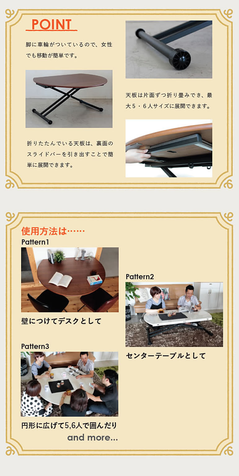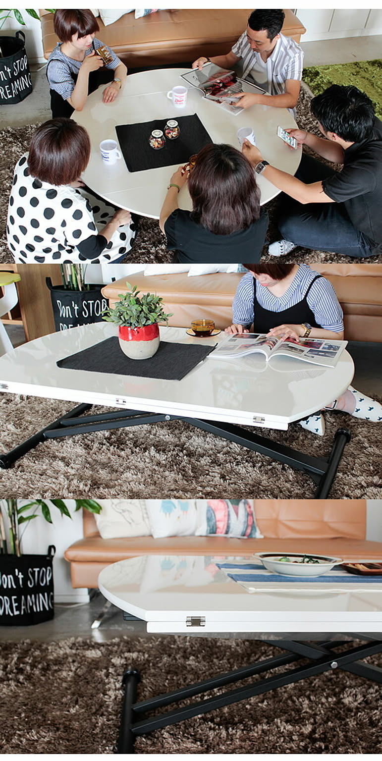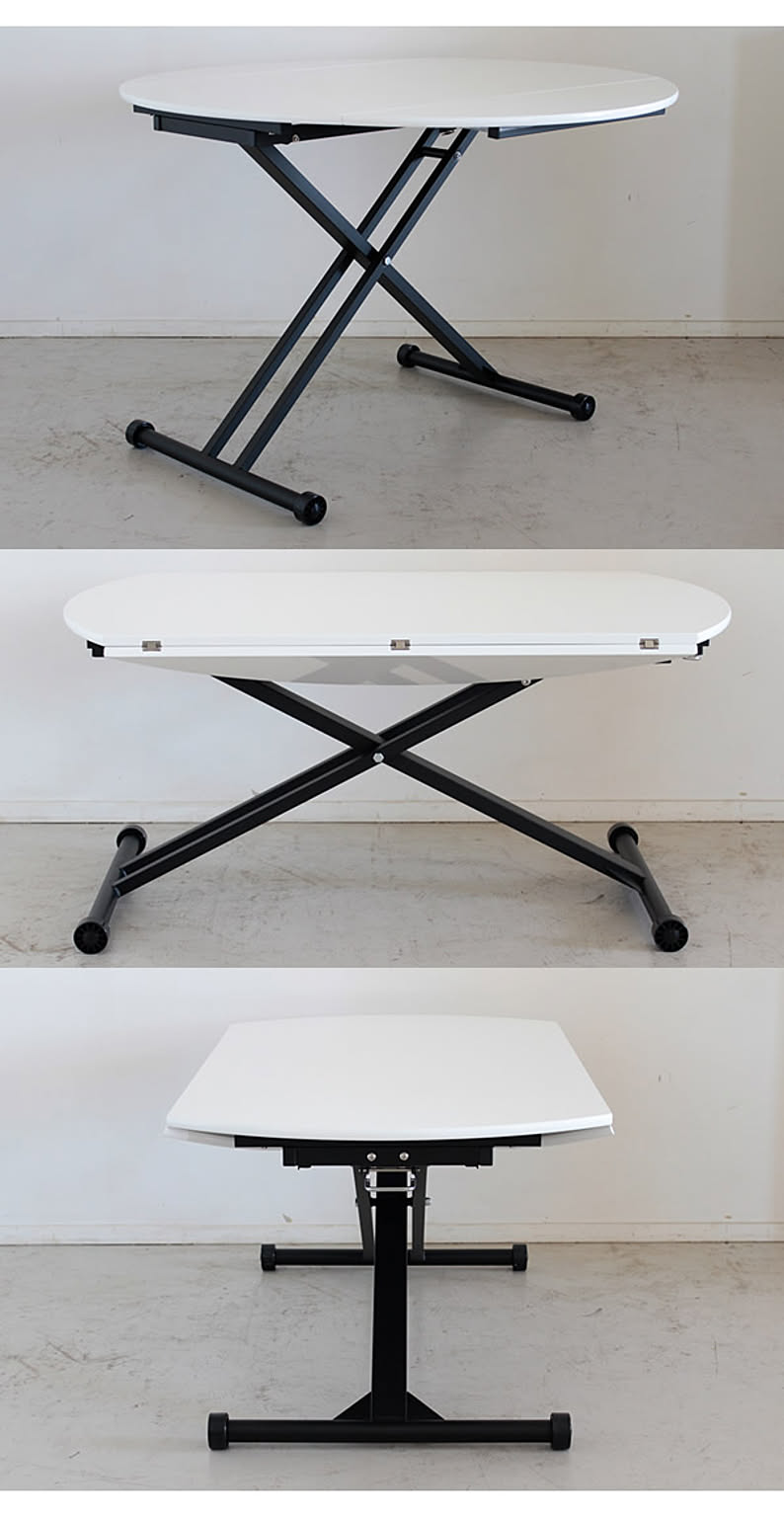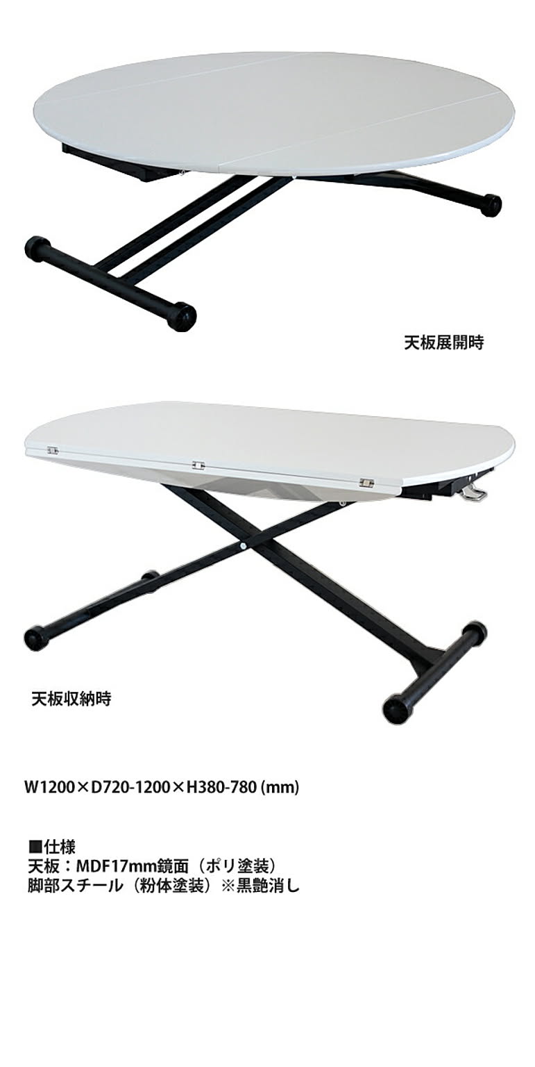 お問い合せ番号aatm0342商品名昇降テーブル センターテーブル デスク 机 つくえ 円形 丸型 ハイ ロー 【eim】 ホワイト WHサイズW1200×D720-1200×H380-780 (mm)カラーホワイト生産国-材質天板:MDF17mm鏡面(ポリ塗装)、脚部スチール(粉体塗装)※黒艶消し組立完成品商品重量-ホワイト鏡面天板とブラック脚の配色がおしゃれな印象のモダン&カジュアルな昇降テーブル。折りたたみ式の面長の天板は、サイドを開くことで簡単に2人用から5人用サイズへと調節が可能なため、活用の幅が広がります。 本商品の関連商品♪ブラウン
