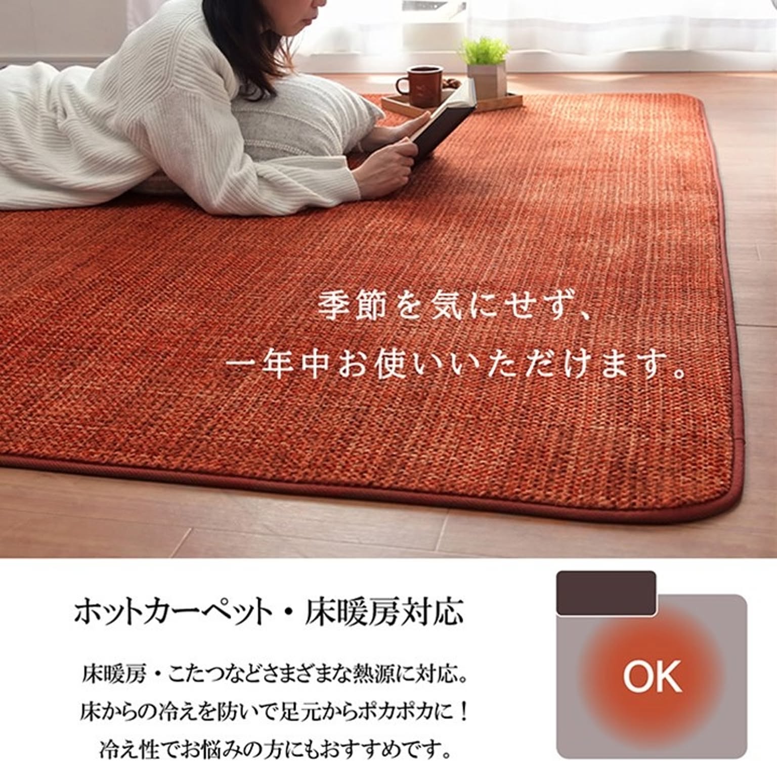 無地系のシンプルデザインです。表地は針抜きでポコポコとした凹凸を出し、なめらかな肌触りの珊瑚マイヤーを使用しています。裏面には滑りにくい加工を施しています。毛足が短いため、お掃除が簡単です。床暖房・ホットカーペット対応です。オールシーズンお使いいただけます。