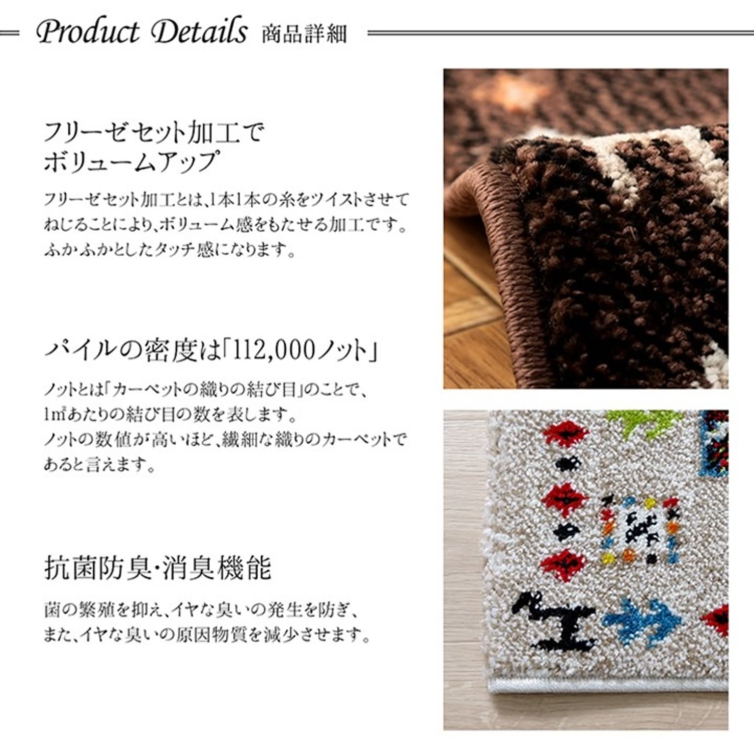 ウィルトン織りの玄関マットです。ラグでも人気の柄です。ウィルトン織りは非常に耐久性の高い織物です。家の中でも靴を履いて生活するヨーロッパで、土足で扱うことを前提として作られておりますので、長時間踏みつけてもヘタリにくく、弾力性もあり長くご使用頂けます。本商品の『繊維の密度を表すノット数』は112,000ノットです。本商品のパイル部分にはポリプロピレン素材を使用しております。ポリプロピレンはヘタリにくく、耐久性に優れ、繊維の中でも軽い素材です。また、汚れが付着しにくく、遊び毛や毛玉が非常に出にくいという特徴もあります。レッド色で明るく、アイボリー色で落ち着いた雰囲気に玄関のワンポイントとして、ご使用していただきますと華やかになり高級感がでます。抗菌・防臭、消臭機能がついていますので、臭いが気になる玄関でも安心してお使いいただけると思います。