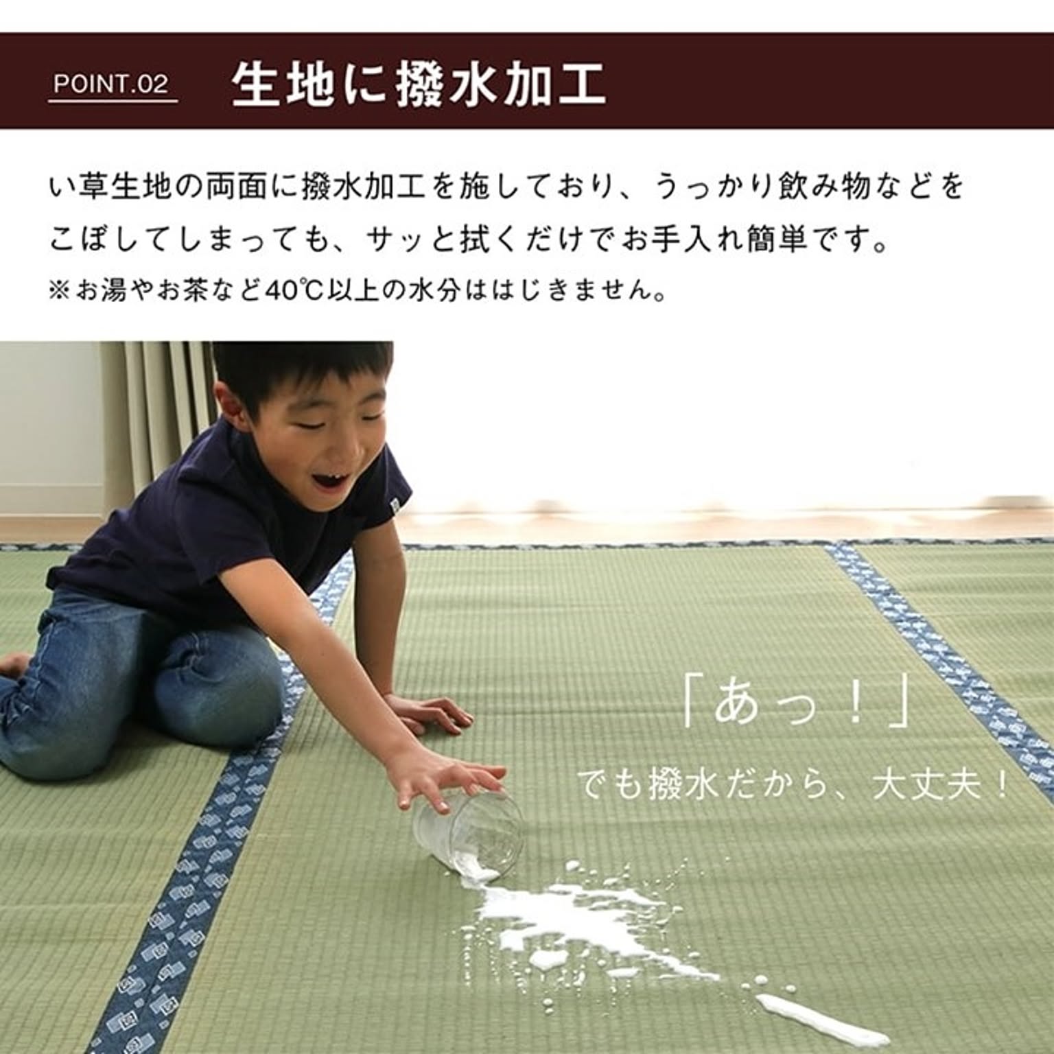 い草生地の両面に撥水加工を施した(ただし、お湯・お茶・コーヒーなど40度以上の水分ははじきません)上敷です。上敷きを敷くだけで畳のお部屋をリフレッシュ出来ます。日焼けしてしまった畳のリフレッシュに、新品の畳を汚さないためのカバーにご使用下さい。一般的なイ草上敷はご使用の前に乾拭きが必要ですが、本商品は生地に泥染めをした上から撥水のコーティングをしているため、乾拭きの必要がありません。届いた商品を広げて頂いてそのままご使用頂けます。生地の表裏両面に撥水加工を施していますので、シミ・汚れの付着防止効果があります。、両面使用可能で経済的なリバーシブルです。長さ115〜120cmの国産(九州産)い草を使用しています。そのうち約88cmを使用しています。ヘリ際はある程度白みを帯びます。(日焼けではありません、い草の根元と先端部分の色です。)い草は長いものほど高級になります。い草は先端部分が赤茶色く、根元が白く真中が青(緑)色です。真中の良質な青の部分を多く使用するほど、丈夫で綺麗な仕上がりとなります。またイ草は使用するうちに日焼けをしますが、真中の青の部分を多く使用したものほど、全体が綺麗にムラなく日焼けし、味が出ます。国産(九州産)のい草を使用しています。国産い草は一本一本が太く、表皮が厚く繊維がキメ細かいので弾力性があり、耐久性に優れています。い草には空気の清浄化作用、湿度の調節作用があり、汚れにくいといった特徴があります。い草に青森ヒバ加工を施しています。(抗菌、防臭効果)表裏の両面が使えて経済的です。