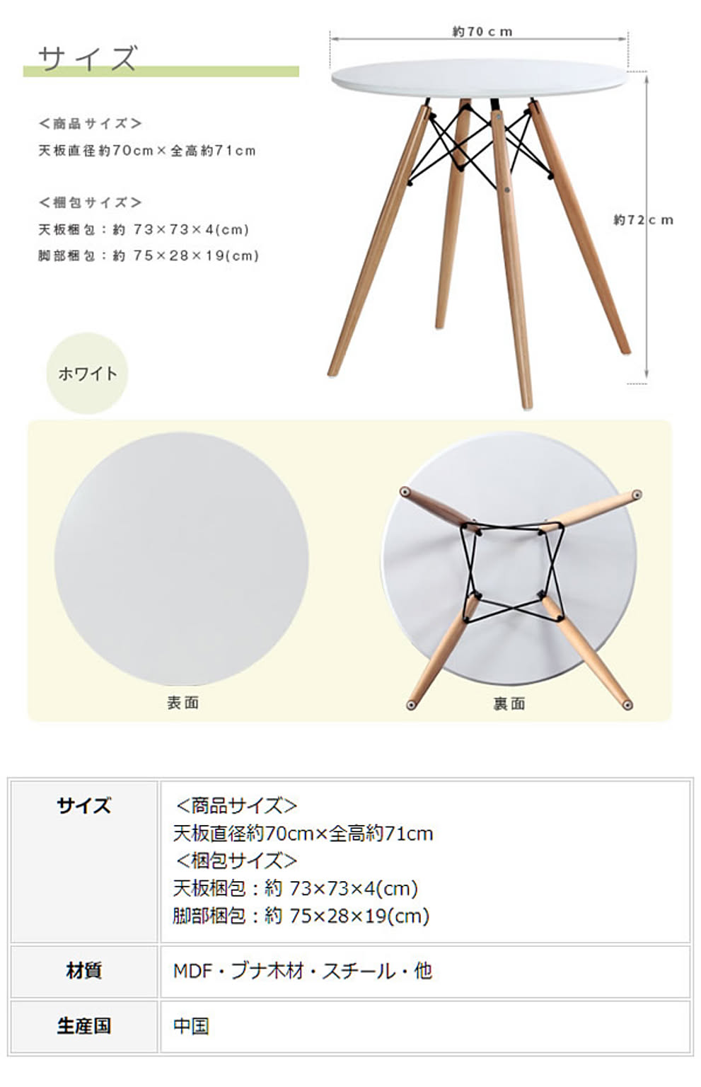 お問い合せ番号aasz0081商品名ラウンドテーブル カフェテーブル コーヒー 円形 丸型 ダイニング 【cereg】 ホワイトサイズ天板直径約70cm×全高約71cmカラーホワイト生産国中国材質MDF・ブナ木材・スチール・他組立お客様組立式梱包サイズ天板梱包:約 73×73×4cm、脚部梱包:約 75×28×19cmシルエットの美しいベースを取り入れたシンプルな円形テーブル。シンプルでお洒落に演出します。 ※サイズ:±1cm以内の誤差が生じる場合もございます※商品の色について:実際の商品の色にできるだけ近づけるよう、撮影を行っておりますが、商品の色はご使用のモニターによって実際の明るさや色と多少異なって見える場合が御座います。予めご了承ください。本商品の関連商品♪ブラック