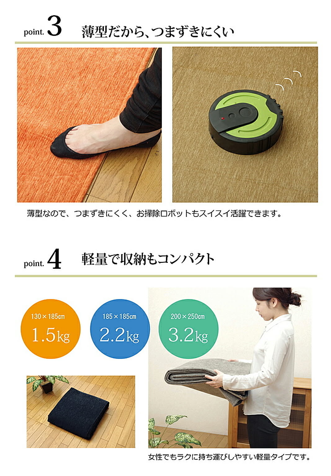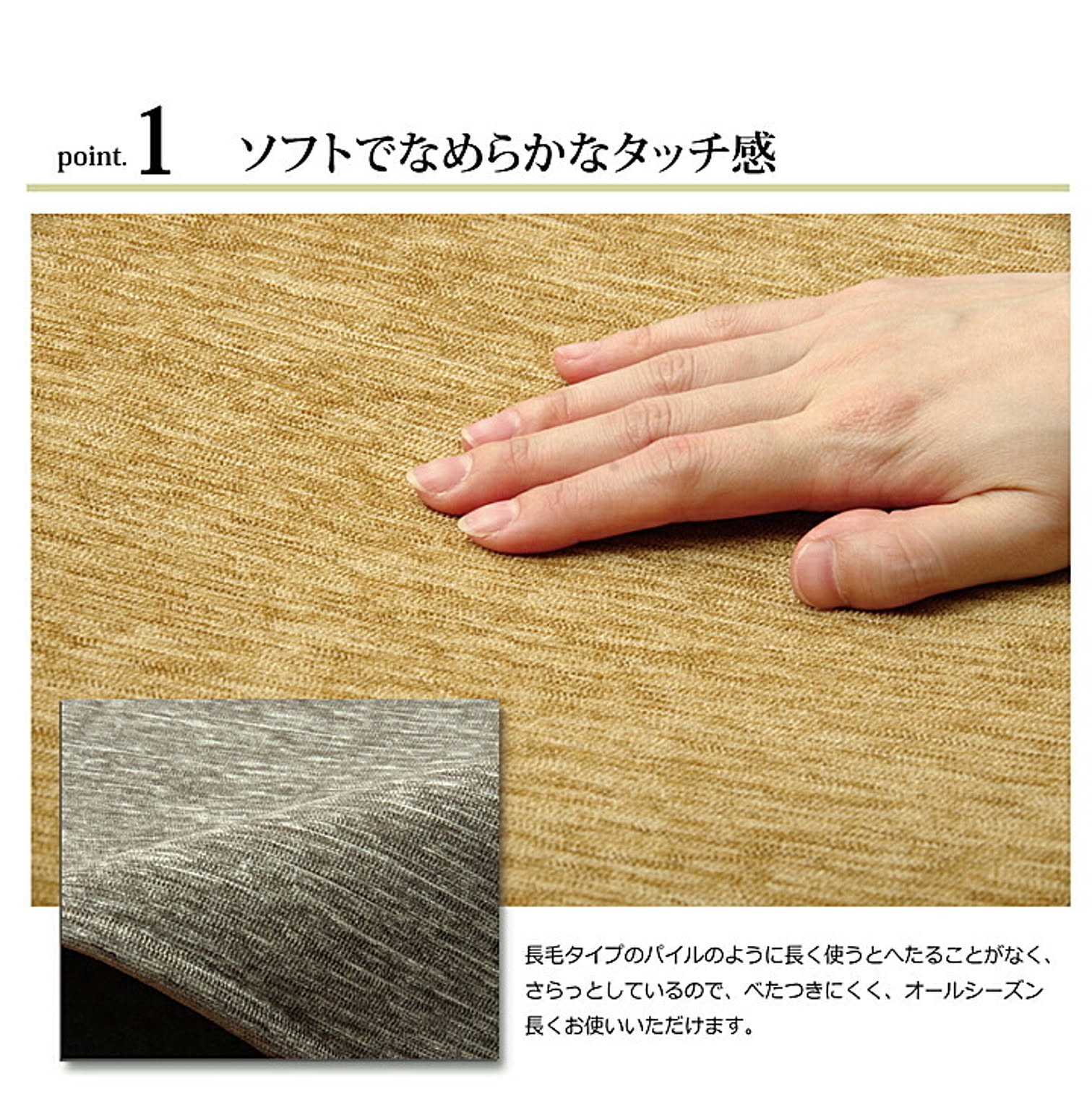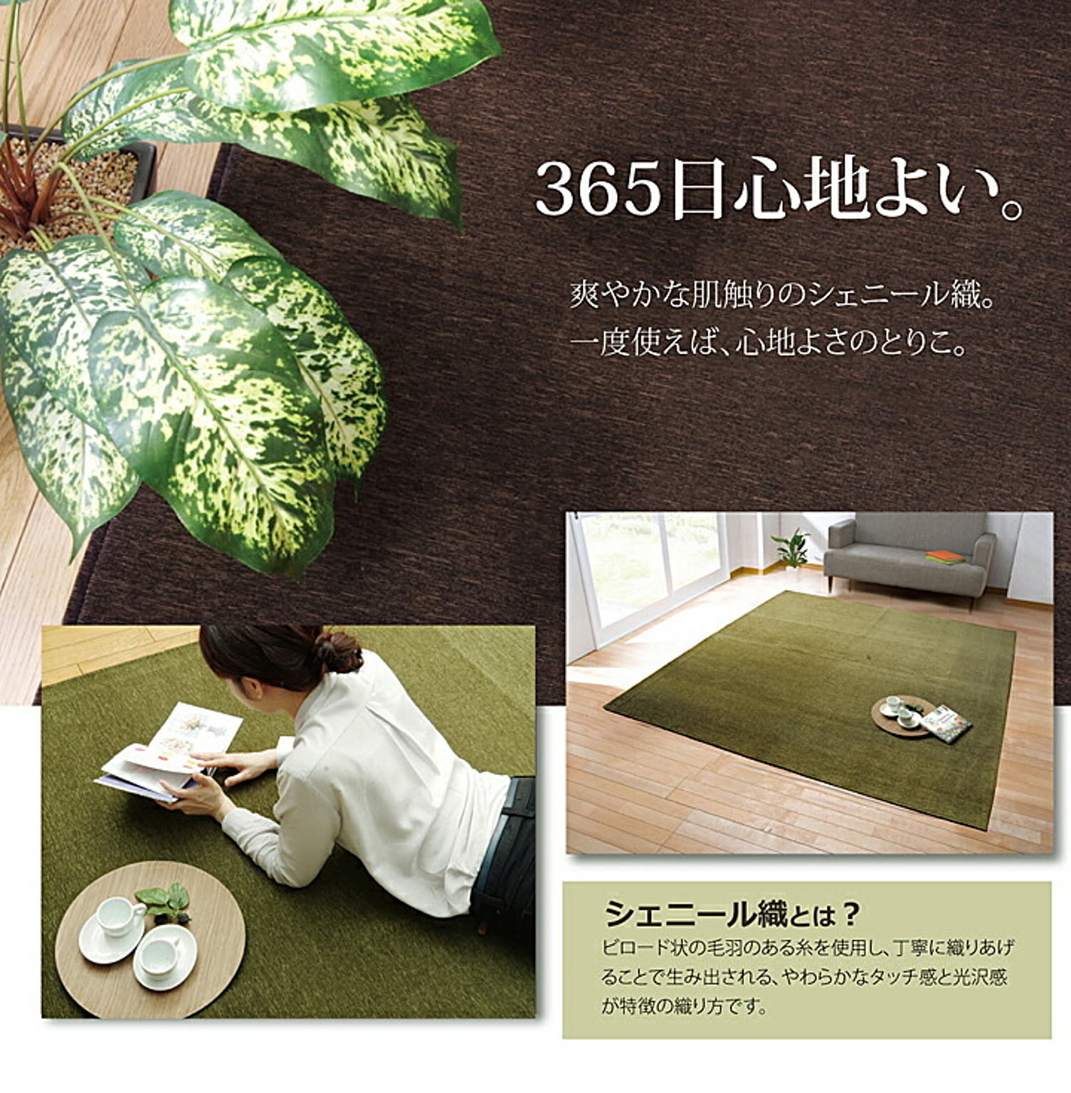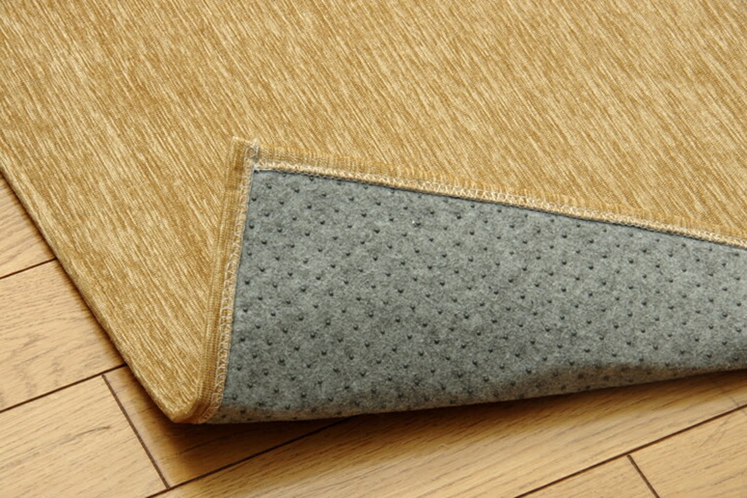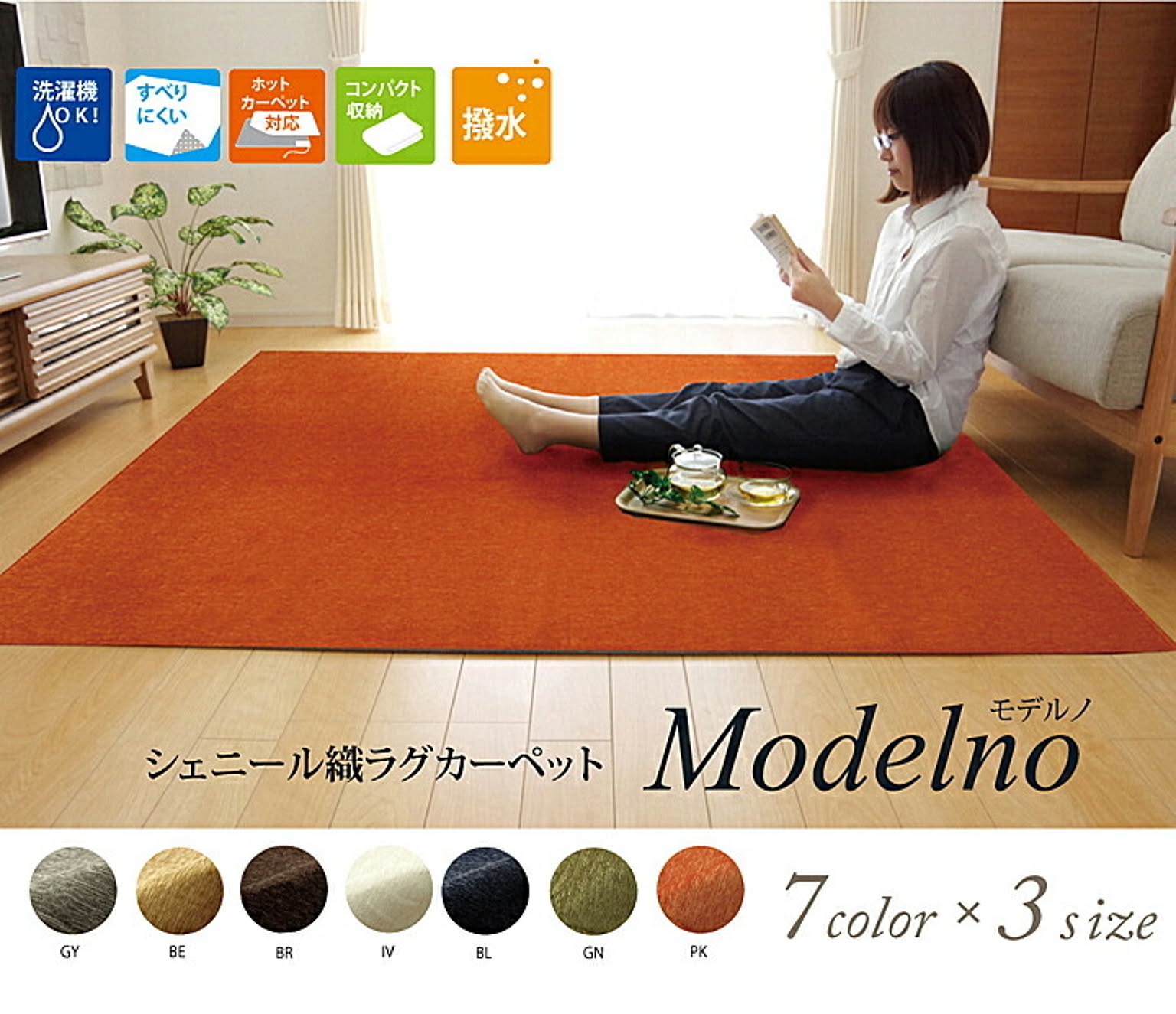 無地のラグです。選べる7色展開でお部屋に合ったお色を選べます。遊び毛が出にいシェニール糸を使用しています。毛足が短いためお掃除も簡単です。裏面にはフローリングの上でもご使用できるよう、滑りにくい加工を施しております。洗濯機で丸洗いでき、お手入れが簡単です。ホットカーペットカバーとしてもご使用できます。