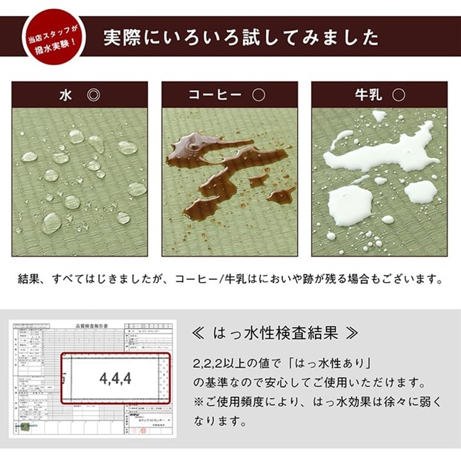 い草生地の両面に撥水加工を施した(ただし、お湯・お茶・コーヒーなど40度以上の水分ははじきません)上敷です。上敷きを敷くだけで畳のお部屋をリフレッシュ出来ます。日焼けしてしまった畳のリフレッシュに、新品の畳を汚さないためのカバーにご使用下さい。一般的なイ草上敷はご使用の前に乾拭きが必要ですが、本商品は生地に泥染めをした上から撥水のコーティングをしているため、乾拭きの必要がありません。届いた商品を広げて頂いてそのままご使用頂けます。生地の表裏両面に撥水加工を施していますので、シミ・汚れの付着防止効果があります。、両面使用可能で経済的なリバーシブルです。長さ115〜120cmの国産(九州産)い草を使用しています。そのうち約88cmを使用しています。ヘリ際はある程度白みを帯びます。(日焼けではありません、い草の根元と先端部分の色です。)い草は長いものほど高級になります。い草は先端部分が赤茶色く、根元が白く真中が青(緑)色です。真中の良質な青の部分を多く使用するほど、丈夫で綺麗な仕上がりとなります。またイ草は使用するうちに日焼けをしますが、真中の青の部分を多く使用したものほど、全体が綺麗にムラなく日焼けし、味が出ます。国産(九州産)のい草を使用しています。国産い草は一本一本が太く、表皮が厚く繊維がキメ細かいので弾力性があり、耐久性に優れています。い草には空気の清浄化作用、湿度の調節作用があり、汚れにくいといった特徴があります。い草に青森ヒバ加工を施しています。(抗菌、防臭効果)表裏の両面が使えて経済的です。