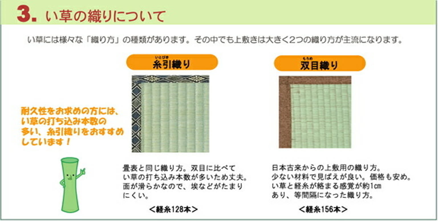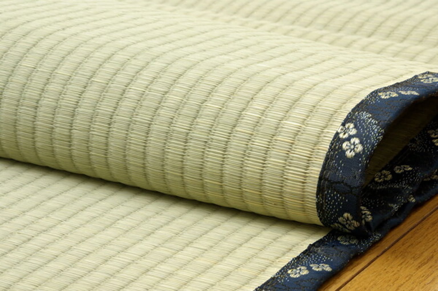 上敷きを敷くだけで畳のお部屋をリフレッシュ出来ます。日焼けしてしまった畳のリフレッシュに、新品の畳を汚さないためのカバーにご使用下さい。長さ120cm以上の長い国産(九州産)い草を使用しています。そのうち約95cmを使用しています。ヘリ際の白い部分が少ない、長いイ草を使用した高級な商品です。(白い部分は日焼けではありません、い草の根元と先端部分の色です。)い草は長いものほど高級になります。い草は先端部分が赤茶色く、根元が白く真中が青(緑)色です。真中の良質な青の部分を多く使用するほど、丈夫で綺麗な仕上がりとなります。またイ草は使用するうちに日焼けをしますが、真中の青の部分を多く使用したものほど、全体が綺麗にムラなく日焼けし、味が出ます。こちらの商品は畳表と同じ織り方の糸引織で仕上げました。双目織りと比べて、い草の打ち込み本数が多いため丈夫です。表面が滑らかなので、ホコリなどがたまりにくいのが特徴です。長くご使用されたい方や、耐久性をお求めの方には糸引織をおすすめします。国産(九州産)のい草を使用しています。国産い草は一本一本が太く、表皮が厚く繊維がキメ細かいので弾力性があり、耐久性に優れています。い草には空気の清浄化作用、湿度の調節作用があり、汚れにくいといった特徴があります。い草に青森ヒバ加工を施しています。(抗菌、防臭効果)表裏の両面が使えて経済的です。