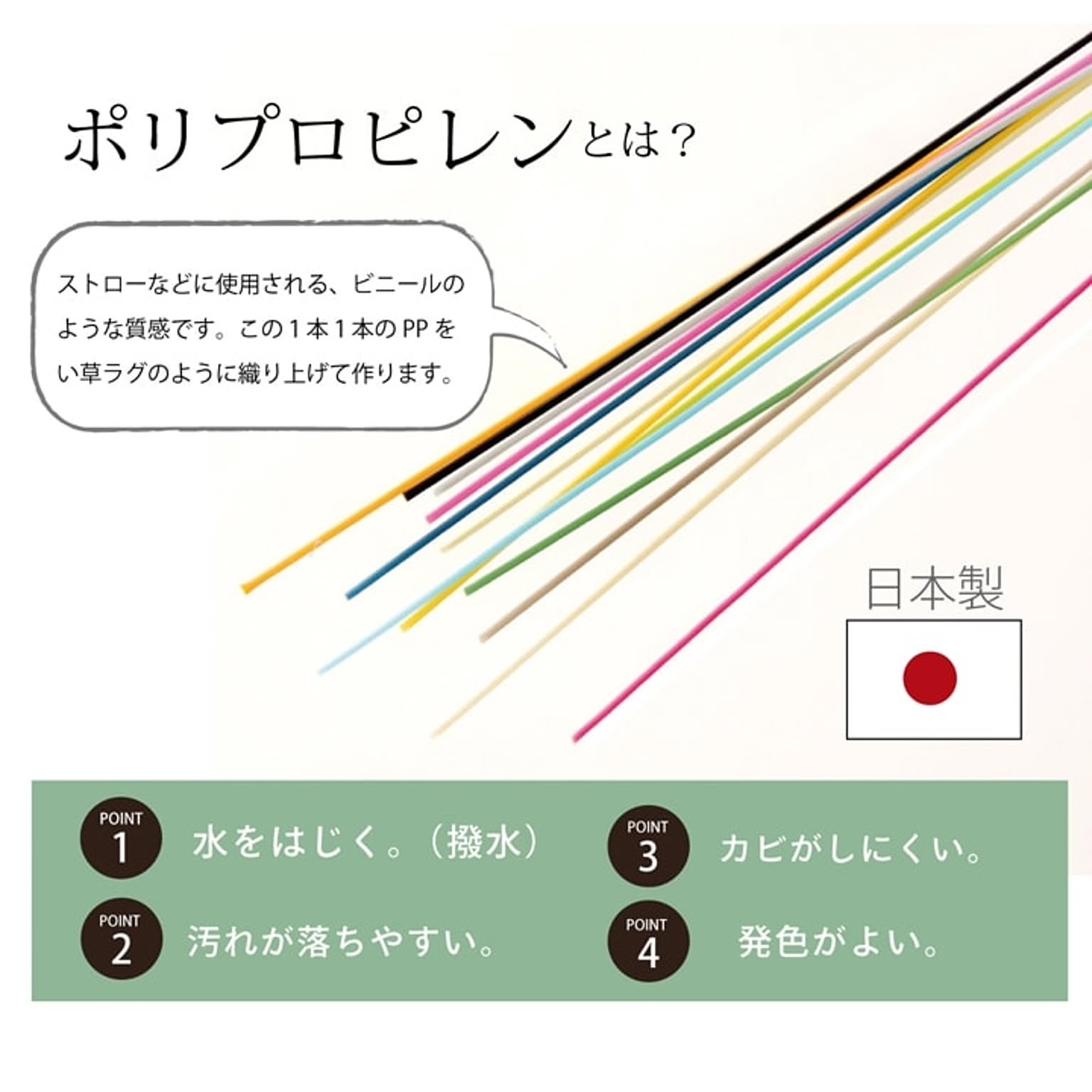 ポリプロピレン素材を細いパイプ状にして織り込んだ敷物です。強度が高くしっかりとしています。裏には国産のウレタンフォームを使用しクッション性と滑りにくくしました。お子様の部屋に、リビングに最適な万能カーペットです。