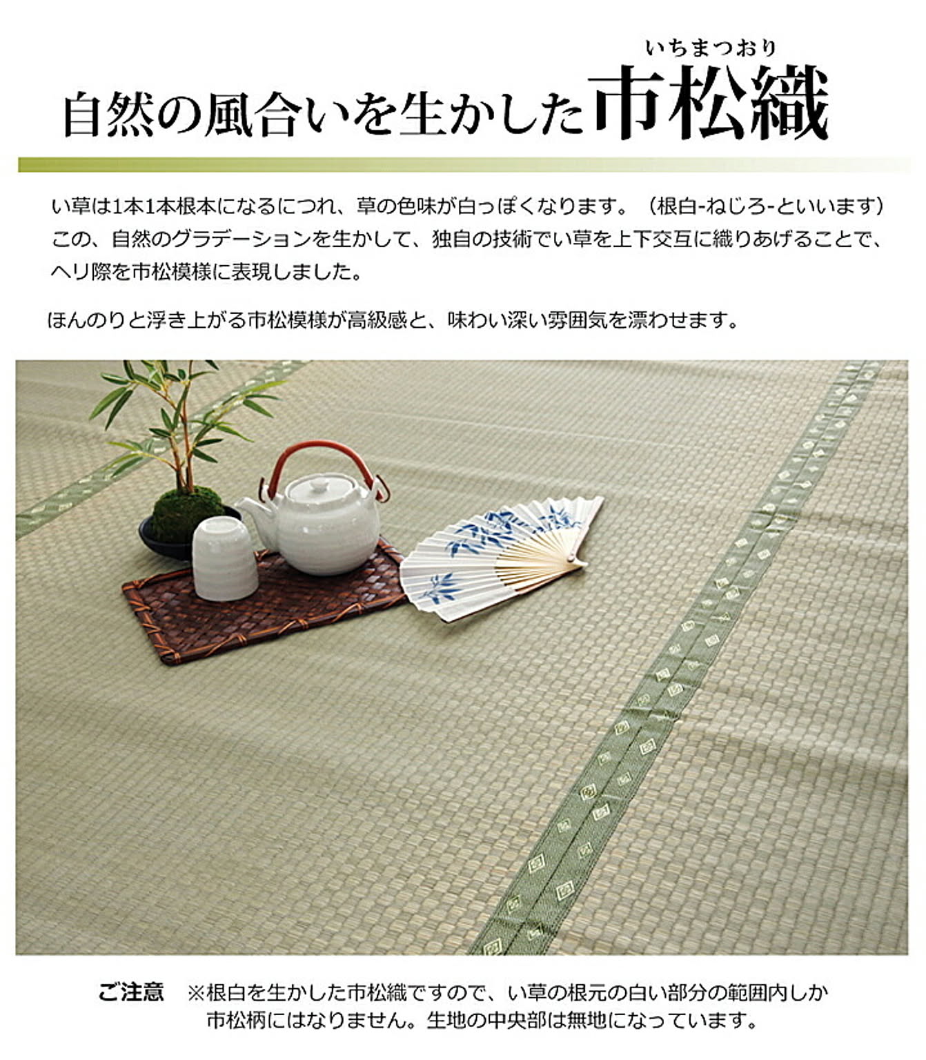 珍しい(ヘリ際のみ)市松柄の上敷きです。上敷きを敷くだけで畳のお部屋をリフレッシュ出来ます。日焼けしてしまった畳のリフレッシュに、新品の畳を汚さないためのカバーにご使用下さい。メーカー独自の技術で織機を改造し、素材の本来の色と織りだけで市松柄を表現しました。無地の上敷きでは個性がない、もっと高級感のある上敷きがほしいという方にお勧めです。長さ115〜120cm程の国産(イ草の産地熊本県八代産)い草を使用しています。そのうち約95cmを使用しています。通常ヘリ際は強く白みを帯びます。(日焼けではありません、い草の根元と先端部分の色です。)このイ草の根元と先端の色が違う特徴を活かし、市松柄を表現しております。(なので、根元の白い部分の範囲内しか市松柄になりません。真中部分は無地になります。)い草は長いものほど高級になります。い草は先端部分が赤茶色く、根元が白く真中が青(緑)色です。国産(熊本県八代産)のい草を使用しています。国産い草は一本一本が太く、表皮が厚く繊維がキメ細かいので弾力性があり、耐久性に優れています。い草には空気の清浄化作用、湿度の調節作用があり、汚れにくいといった特徴があります。青森県のヒバの木から抽出した「ヒバエッセンス」をメーカー独自の技術で生地表面に加工しました。ヒバエッセンスにはヒノキチオールという、天然物質としては極めて抗菌性の高い成分が含まれています。(無加工品に比べ抗菌、防臭効果があります。)表裏の両面が使えて経済的です。※自然素材であること、また職人が一つ一つ手作業にて加工を行うため、形状のバラツキや表示サイズと多少ことなることがありま