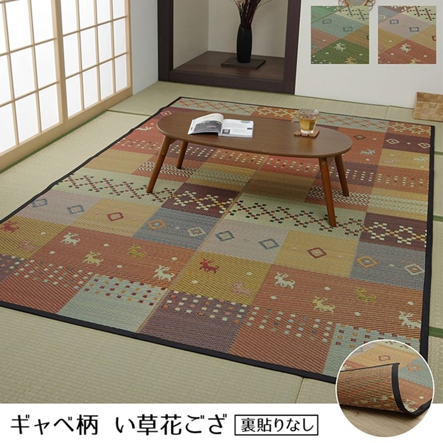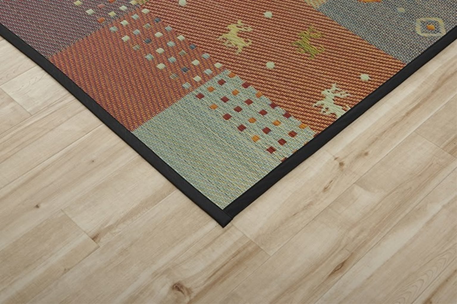 ギャベ柄で明るいデザインに仕上げたい草花ござカーペットです。 和室・洋室どちらにも合わせやすいデザインに仕上げました。和室には裏張り無しの商品、洋室には裏張り有りの商品がお勧めです。天然素材のい草には、お部屋の空気をきれいにする空気清浄効果、お部屋の湿度を調整する調湿効果、汗臭、加齢臭、ペット臭などの嫌な臭いを消臭する消臭効果など優れた機能性があります。 青森県のヒバの木から抽出した「ヒバエッセンス」をメーカー独自の技術で生地表面に加工しました。ヒバエッセンスにはヒノキチオールという、天然物質としては極めて抗菌性の高い成分が含まれています。(無加工品に比べ、抗菌防臭効果があります。)