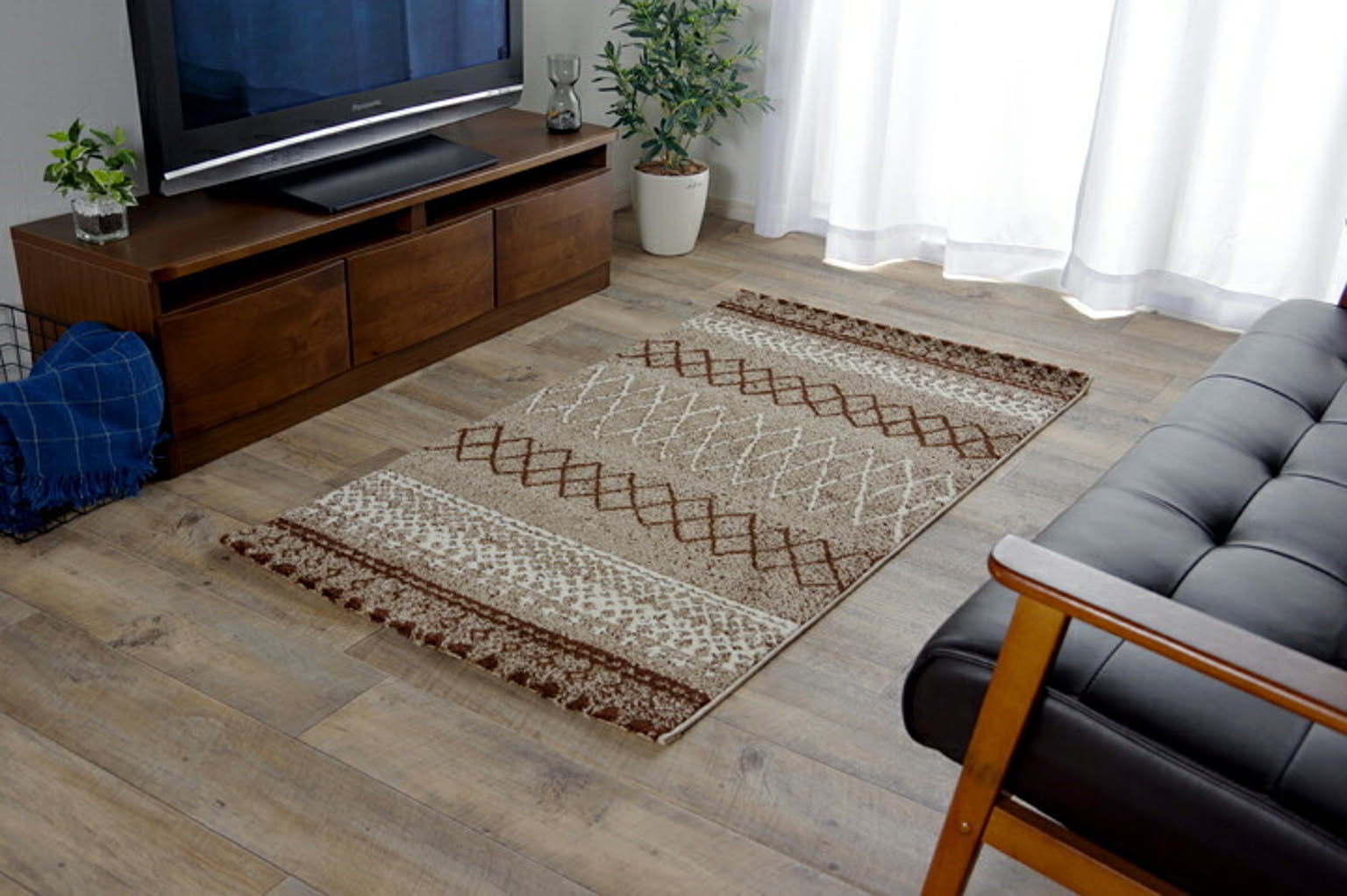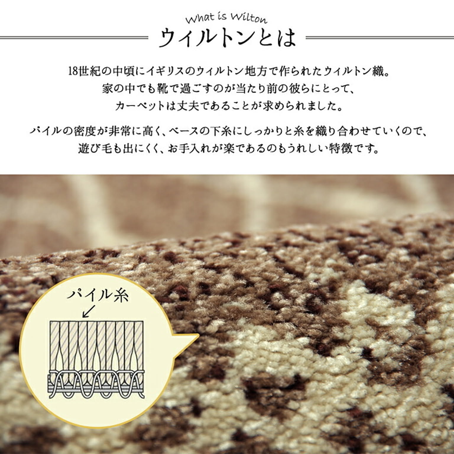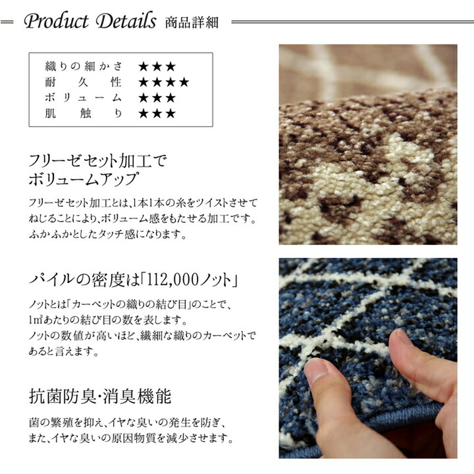 トルコ製のウィルトン織りカーペットです。本商品のパイル部分にはポリプロピレン素材を使用しております。ポリプロピレンはヘタリにくく、耐久性に優れ、繊維の中でも軽い素材です。また、汚れが付着しにくく、遊び毛や毛玉が非常に出にくいという特徴もあります。本商品にはフリーゼセット加工を施しております。フリーゼセット加工でパイルをツイストすることによりボリューム感を出し、ふかふかとした肌感触に仕上げました。ホットカーペットカバーや床暖房にも対応しております。安心して年間お使い頂けるカーペットです。