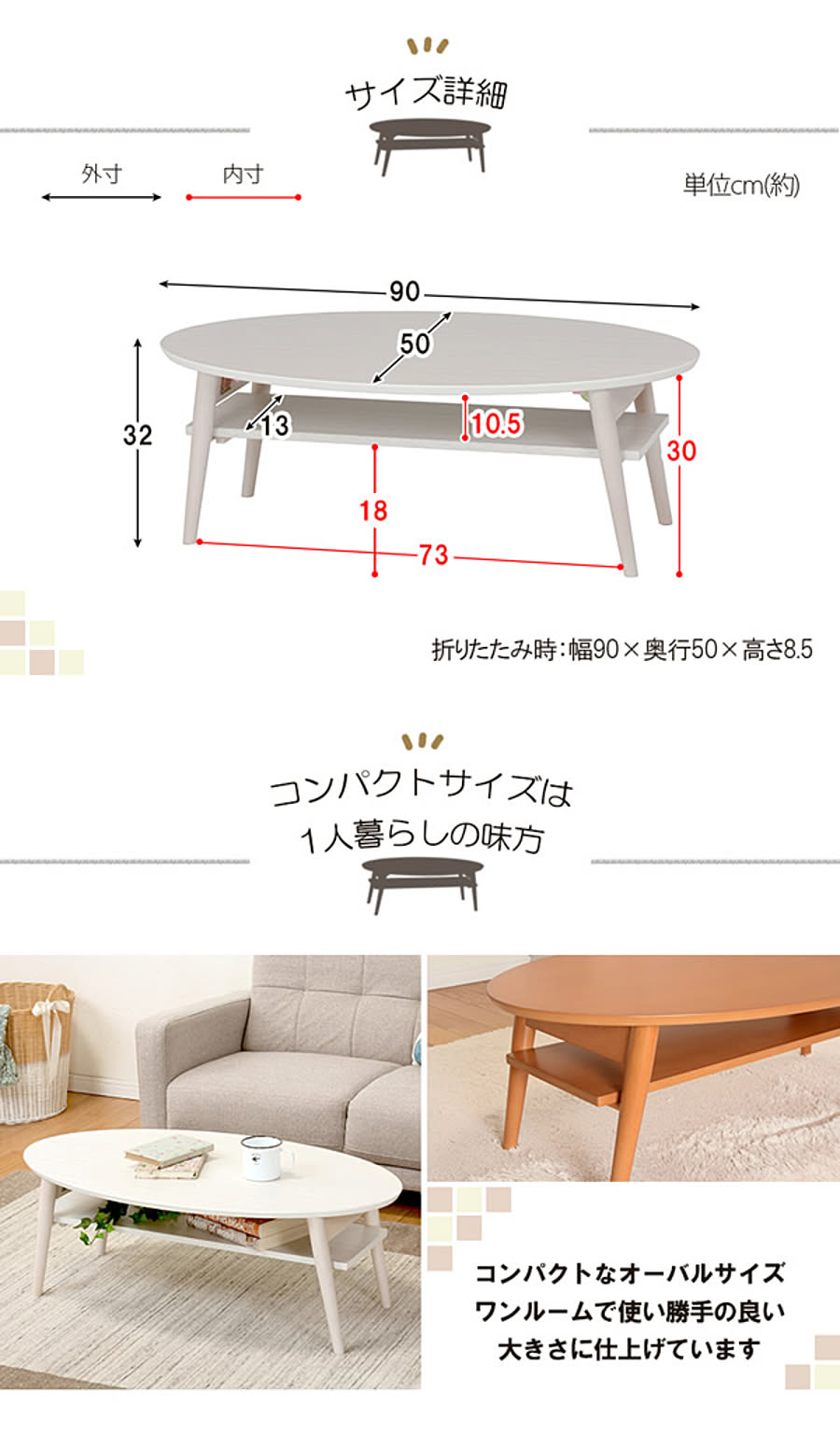 お問い合せ番号aata0321商品名センターテーブル ローテーブル 棚付き 折れ脚 折脚 オーバル 楕円 【matona】 ナチュラルサイズ(約)幅90×奥行50×高さ32cmカラーナチュラル生産国-材質天板:MDF、ラバーウッド突板 脚:ラバーウッド、折りたたみ式組立完成品商品重量-コンパクトで使い勝手の良い折れ脚テーブル。棚もついているので雑誌や新聞をストック可能。オーバルサイズ。 本商品の関連商品♪ホワイトウォッシュ