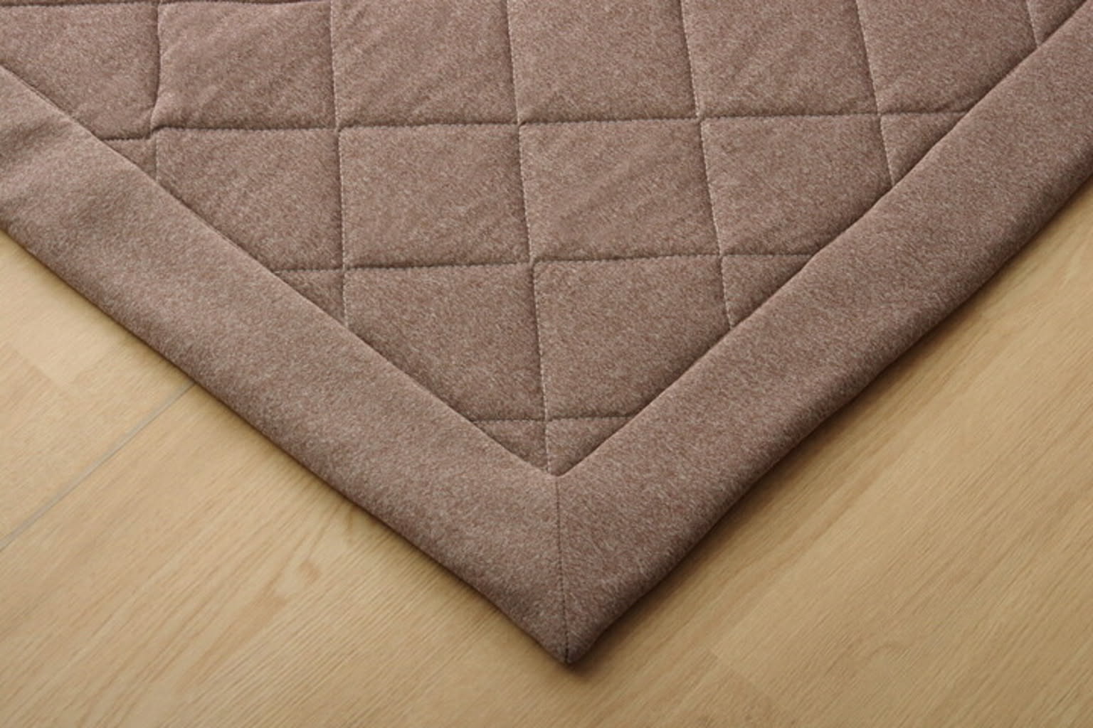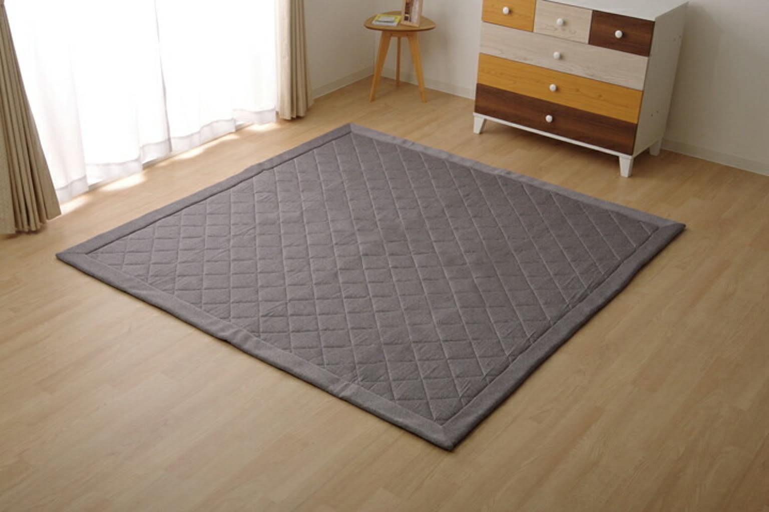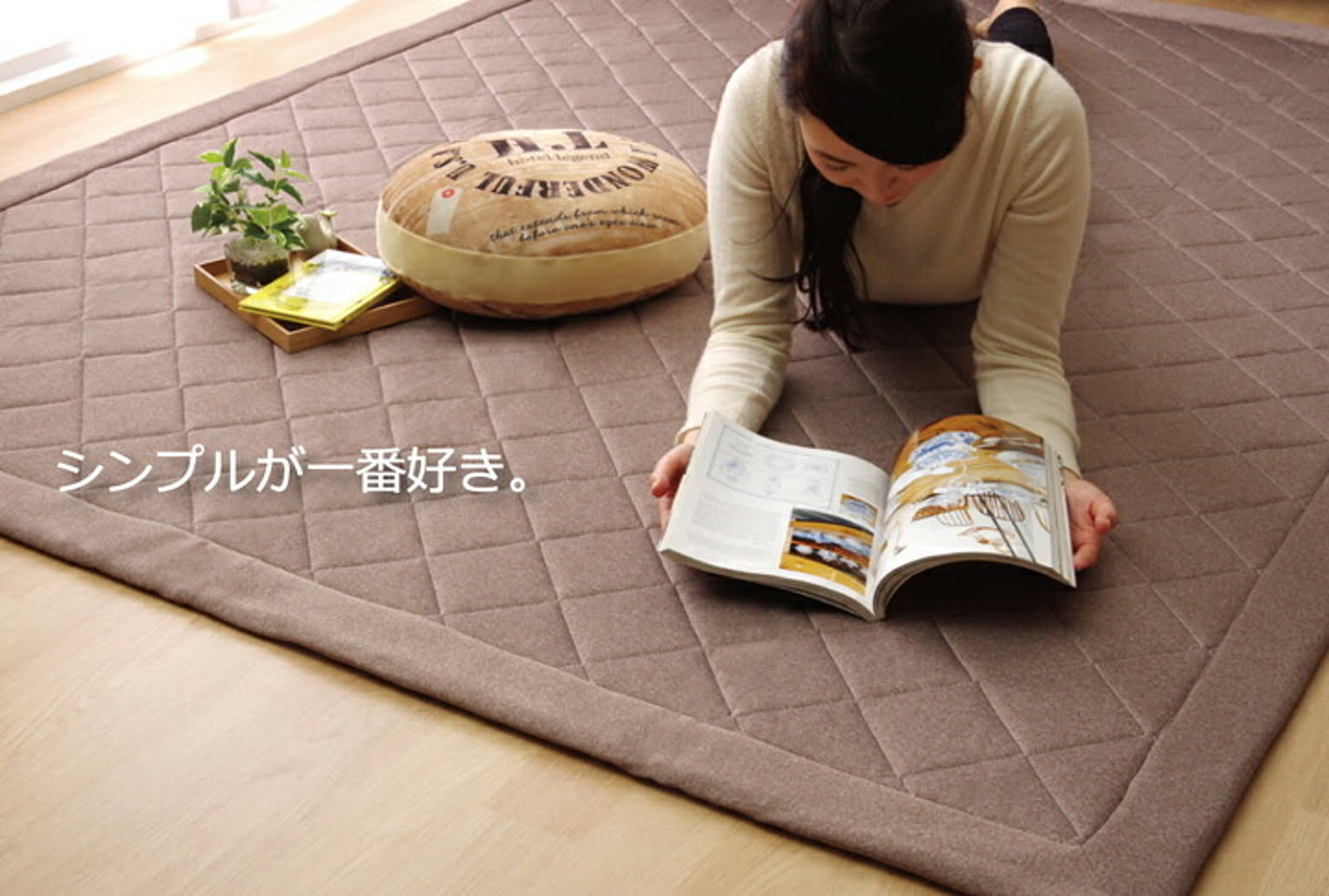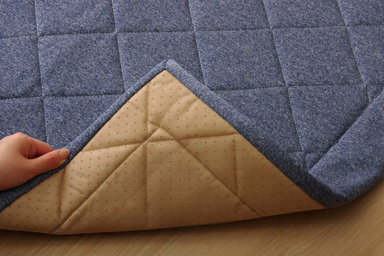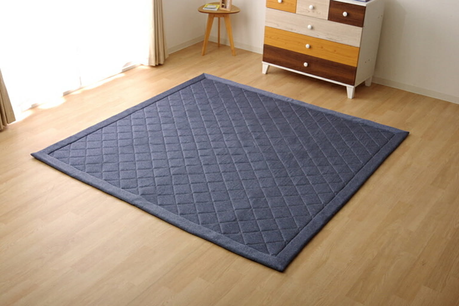 デニム調のキルティングラグカーペットです。キルティング加工をすることで、中わたが寄ったりズレたりしにくくなります。表地にはしなやかで伸縮性のある生地を使用しています。とても柔らかくソフトな風合いです。中材には固わたを使用しており、適度なクッション性があります。フローリングを傷つけにくいよう、裏には不織布を貼っています。またすべりにくい加工も施しておりますのでフローリングでも安心してご使用頂けます。ホットカーペットカバーとしてもご使用頂けます。床暖房にも対応可です。季節を選ばすオールシーズンご使用頂けます。