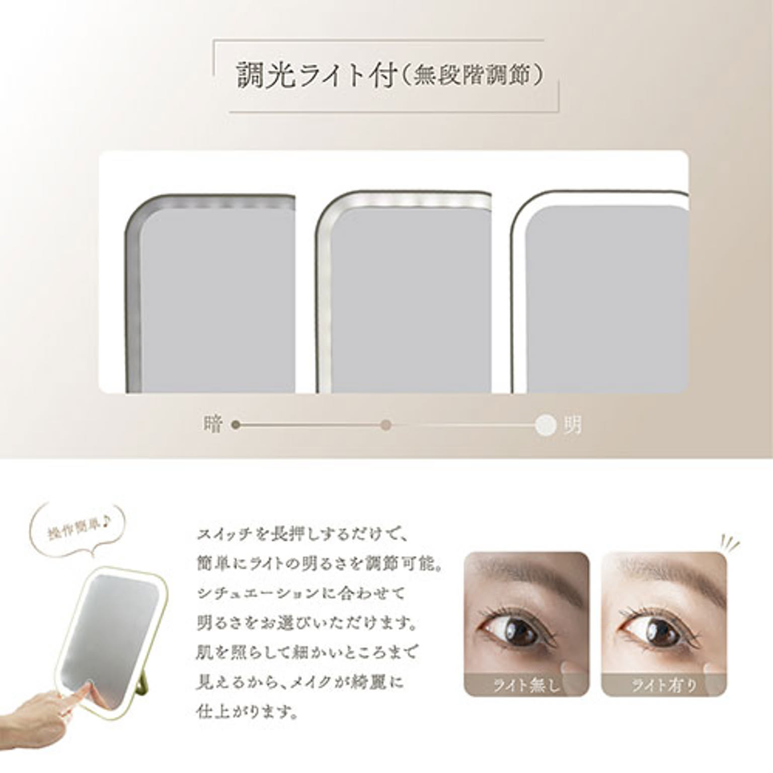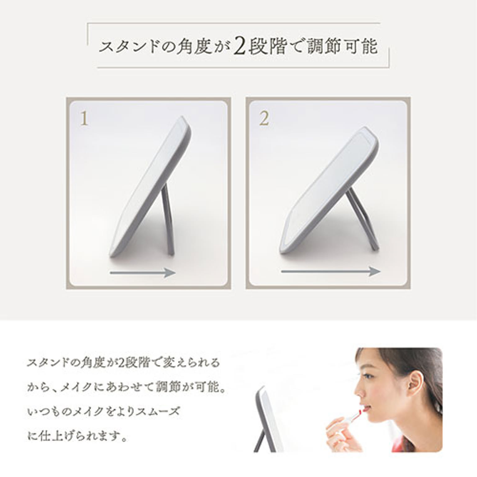 無段階調節の調光ライトが付いたスタンドミラー。スタンドが2段階の角度調節可能で、乾電池式だからいつでもサッと使えてとっても便利です。●スタンドミラー ●調光ライト付き(無段階調整) ●スタンドの角度が2段階で調節可能寸法:約W15×D1.5×H20cm 重量:約225g 個装重量:約280g 材質:ABS/ガラス 電源:乾電池式:単4形アルカリ電池4本(別売) 明るさ:最大約40lm ※WEB画像は実際の商品とは風合いが異なって見える場合があります。