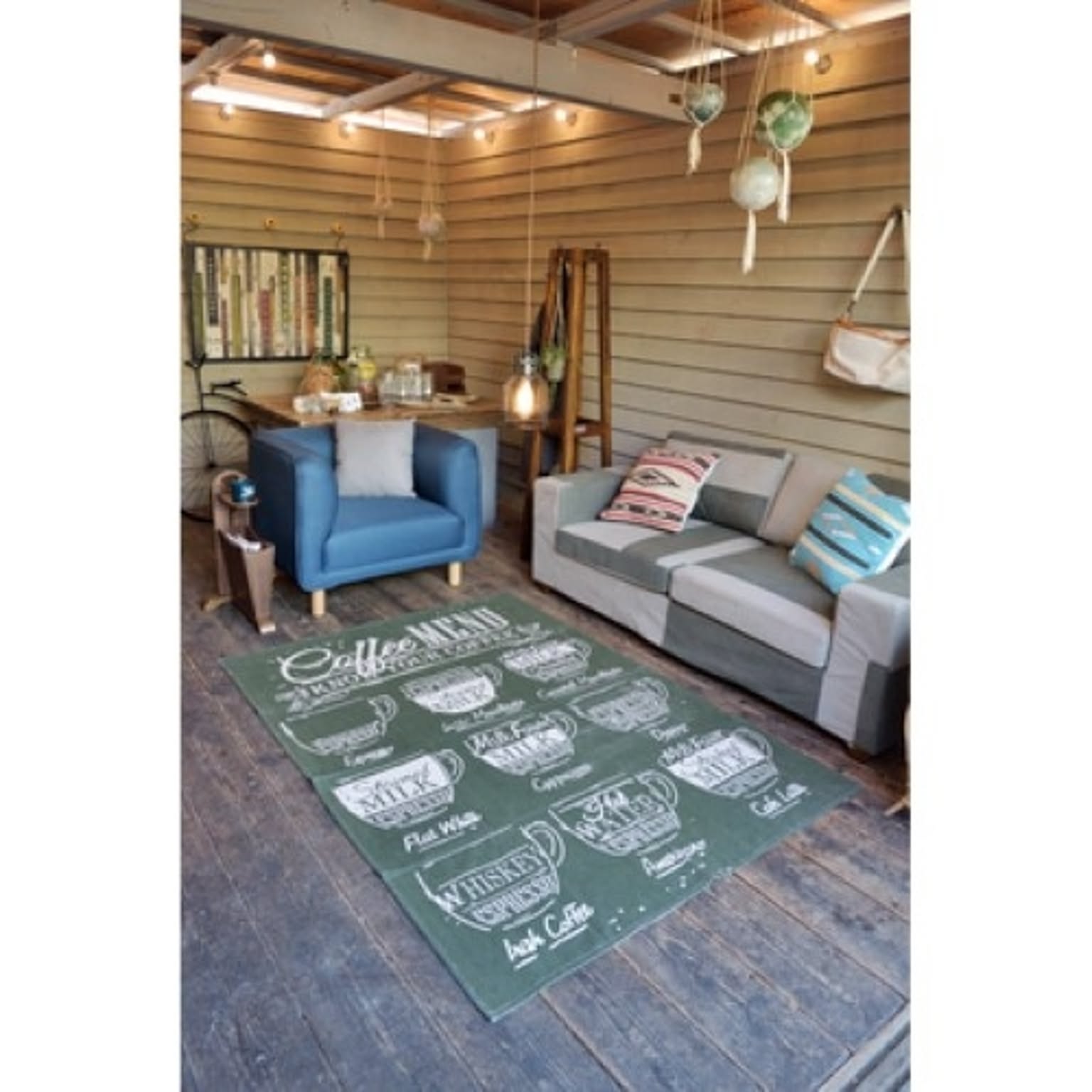 リビング、ダイニングと様々な場所でお使いいただけます黒板にチョークで書いたようなデザインがカフェ調を演出します。色が落ち着いているので、リビング、ダイニングと様々な場所でお使いいただけます。サイズ:W130×D190cm 素材:コットン 生産国:インド