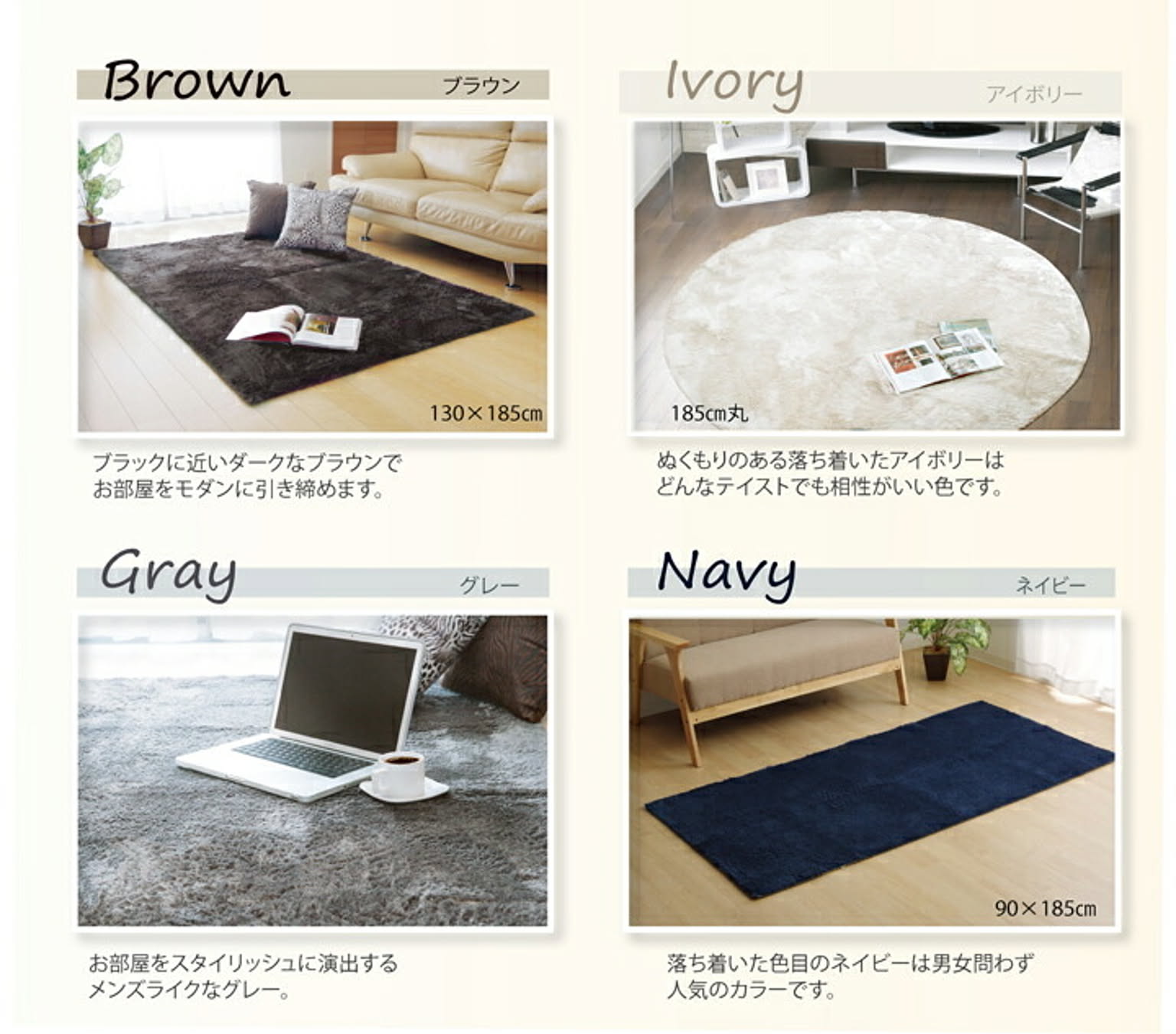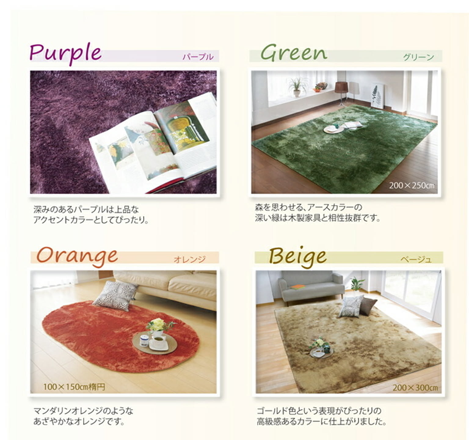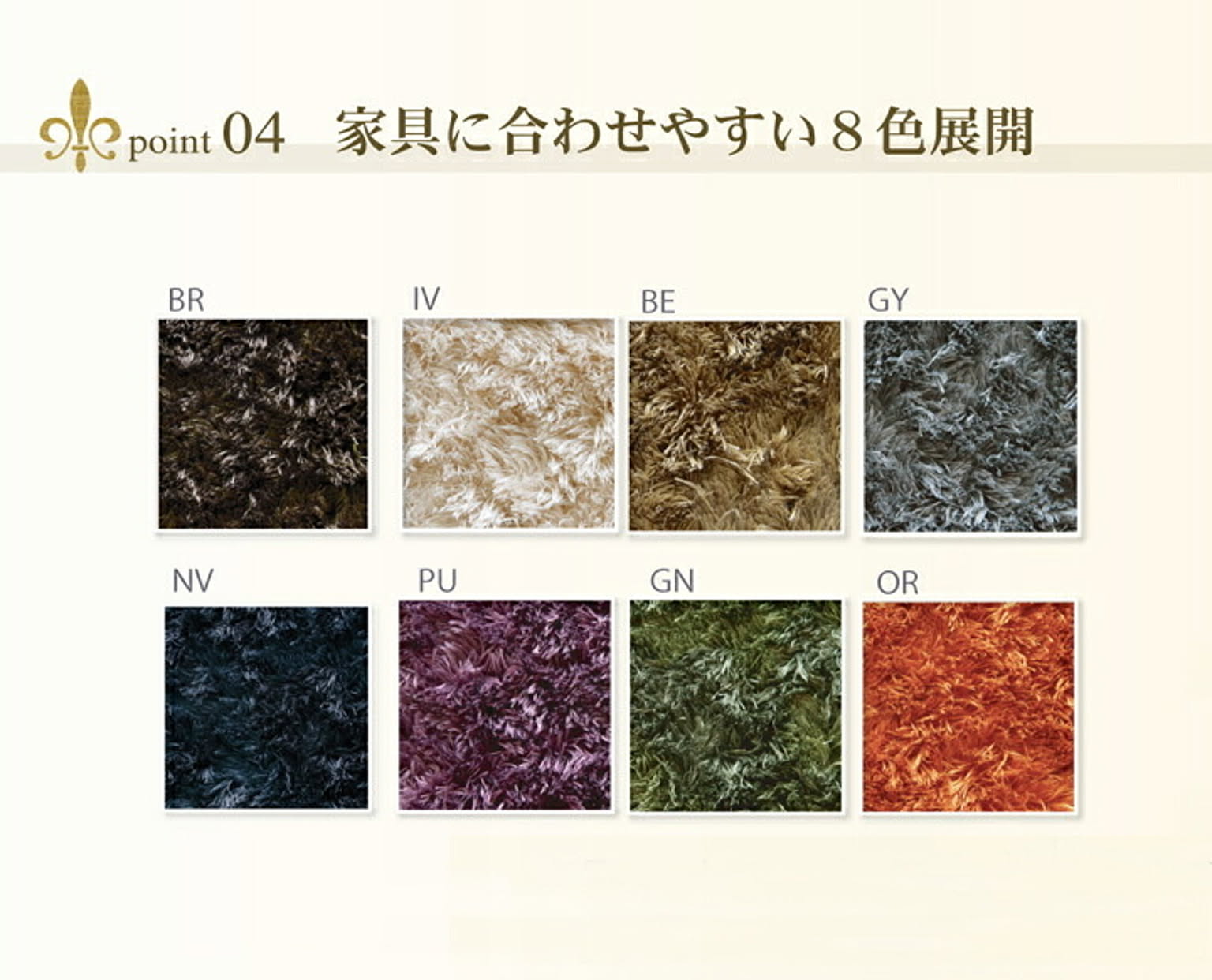 お部屋に合わせやすい高級感あふれるオーバーロック仕様のラグです。シャギー調の毛足は約18mmでふかふかとした感触とさらさらとした肌触りがとても気持ちいい商品です。裏面には滑りにくい加工を施しているためフローリングでも安心してご使用いただけます。7色という多色展開のため、お部屋に合った色をお選びいただけます。
