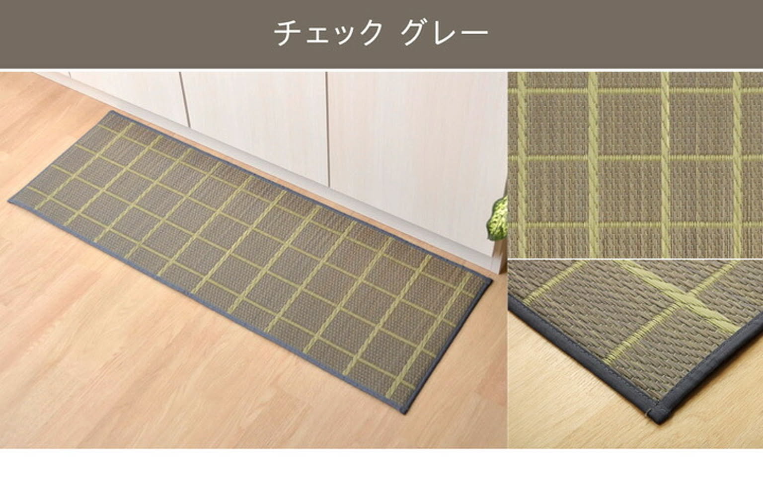 い草のキッチンマットです。キッチンマットの不満を解消してくれる商品です。化繊もののキッチンマットと比べ、汚れにくくシミになりにくいです。小さなゴミでも、ほうきで掃く、掃除機をかけるだけで取り除くことができます。い草自体が持つ油分により汚れを弾くので洗う必要がなく長くご使用いただけます。裏地には国産のウレタンフォームを使用することで,丈夫でクッション性があり滑りにくくしました。