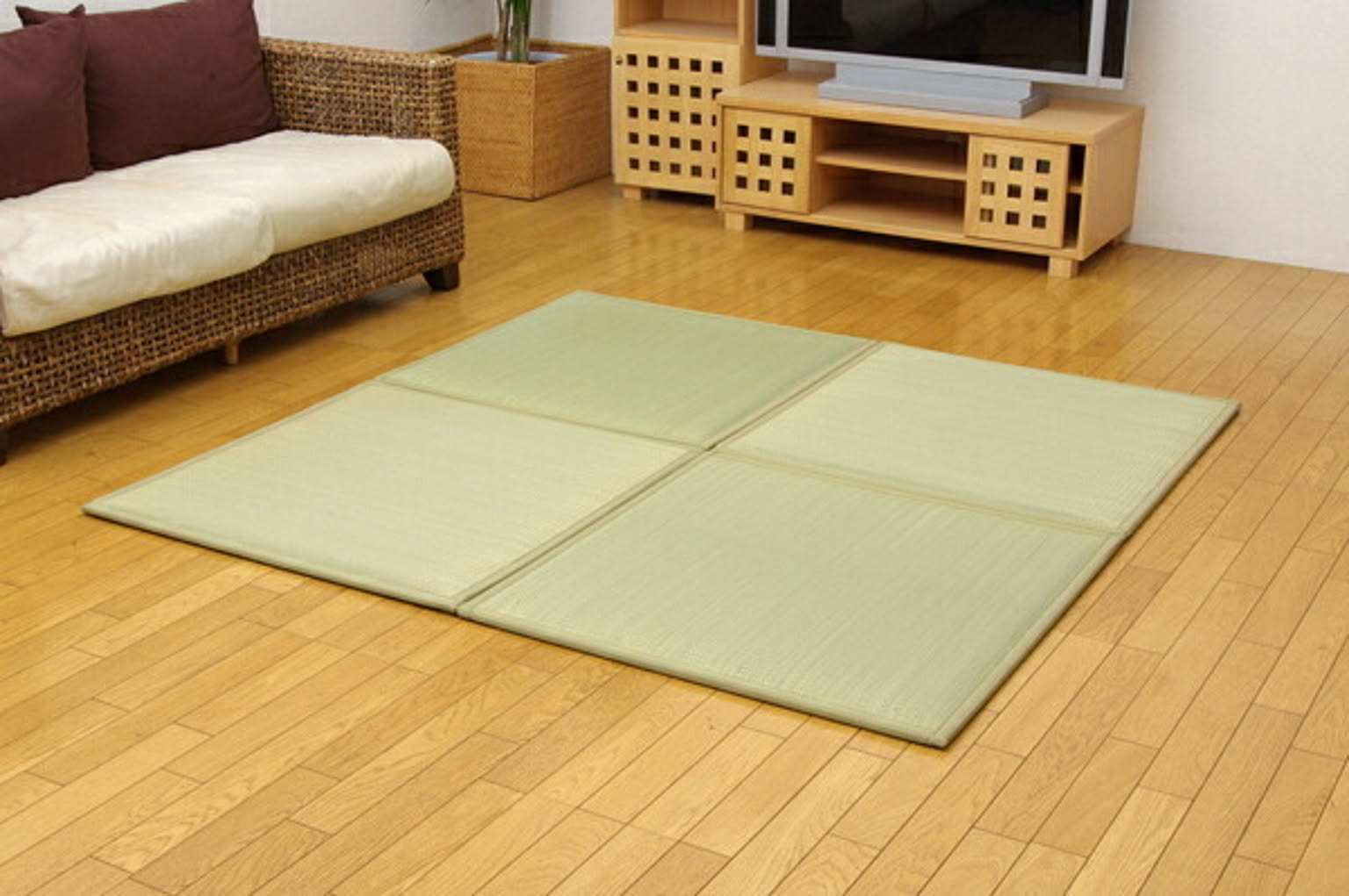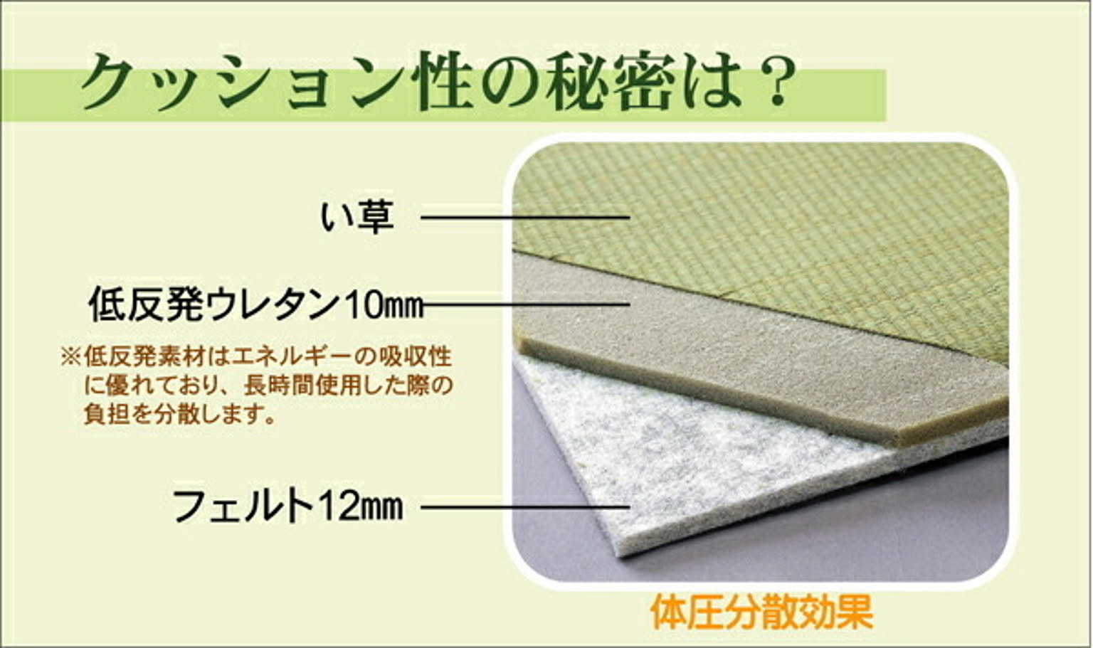 表地=い草 ※2.2目織 中材=低反発ウレタン10mm+フェルト12mm 裏=連結用ジョイント付き ヘリ=PP、PE