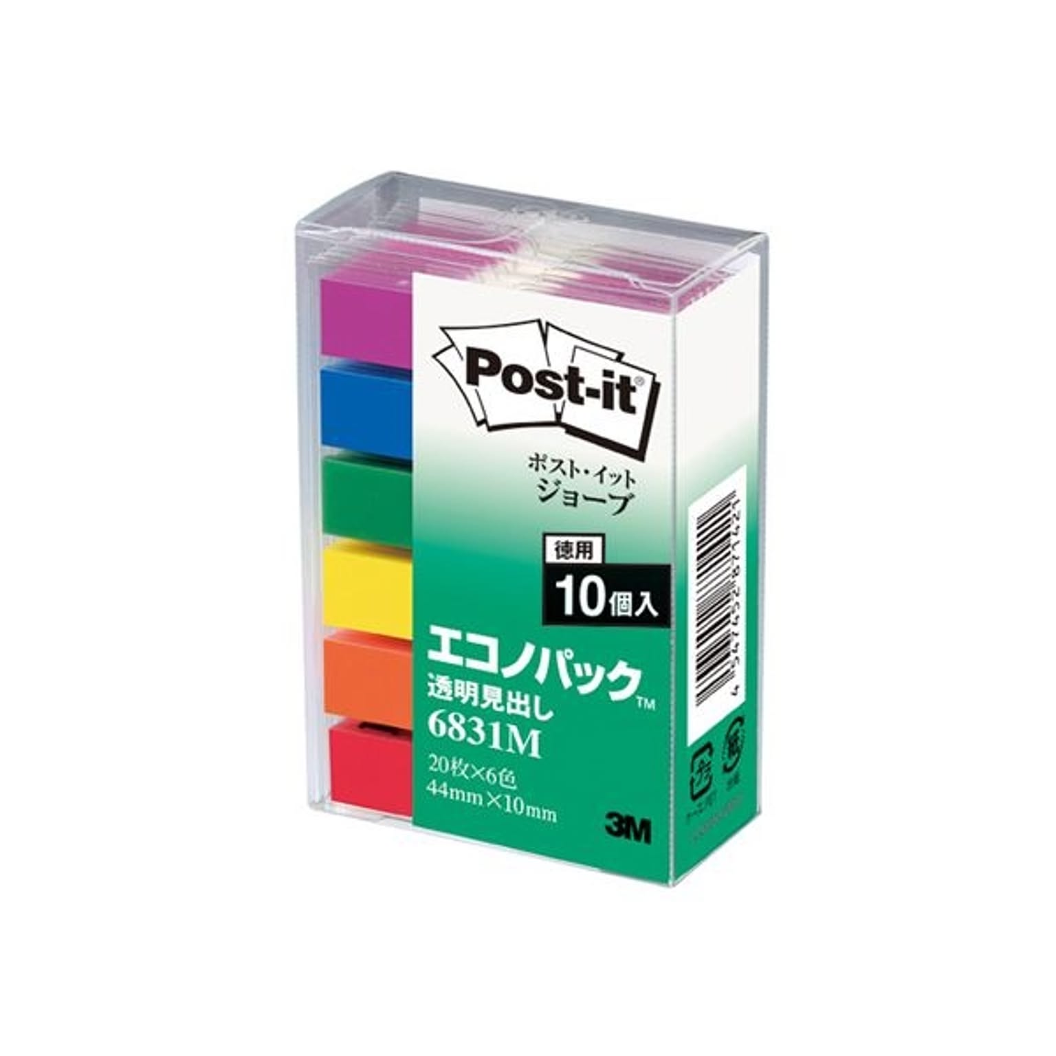 (まとめ) 3M ポストイット ジョーブ エコノパック 透明見出し 44×10mm レインボーカラー6色 業務用パック 6831M 1セット(60冊) 【×2セット】