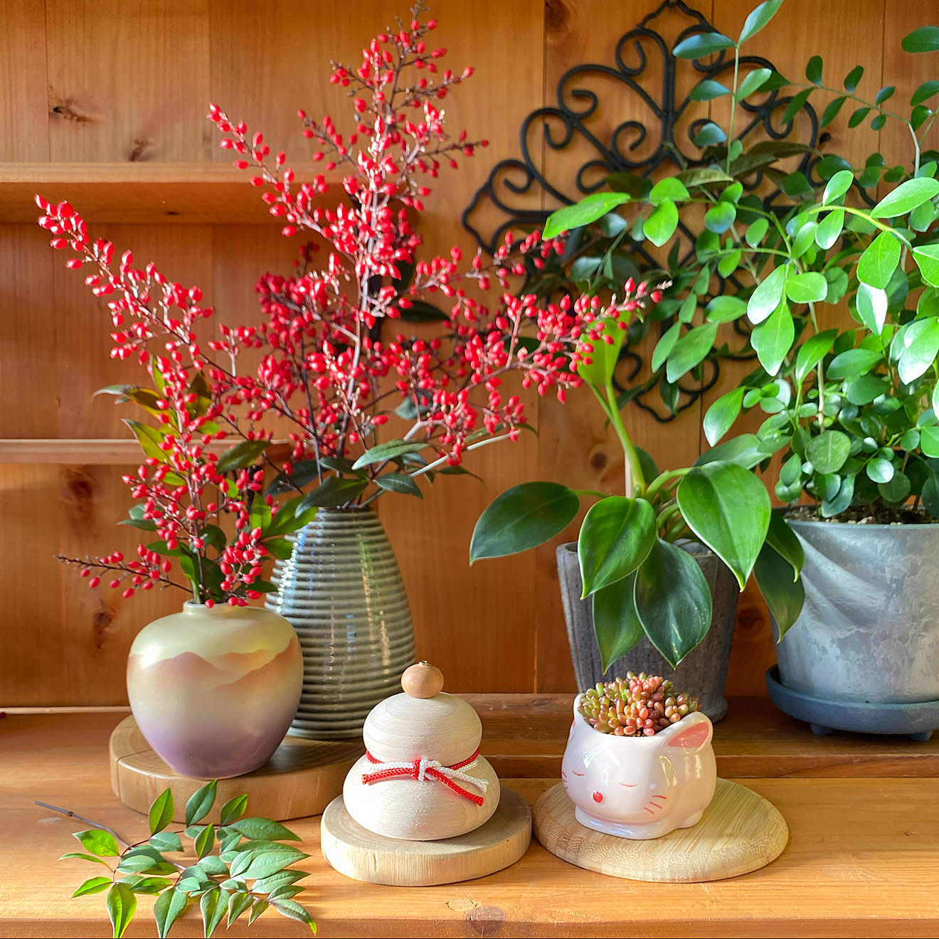 門松のタペストリーや干支の置物、南京を飾るなど、この時期のキーアイテムになるものを加えたディスプレイをコーディネートするのがポイントになりそうです。お客様に目でも楽しんでもらえる玄関を演出したいですね。