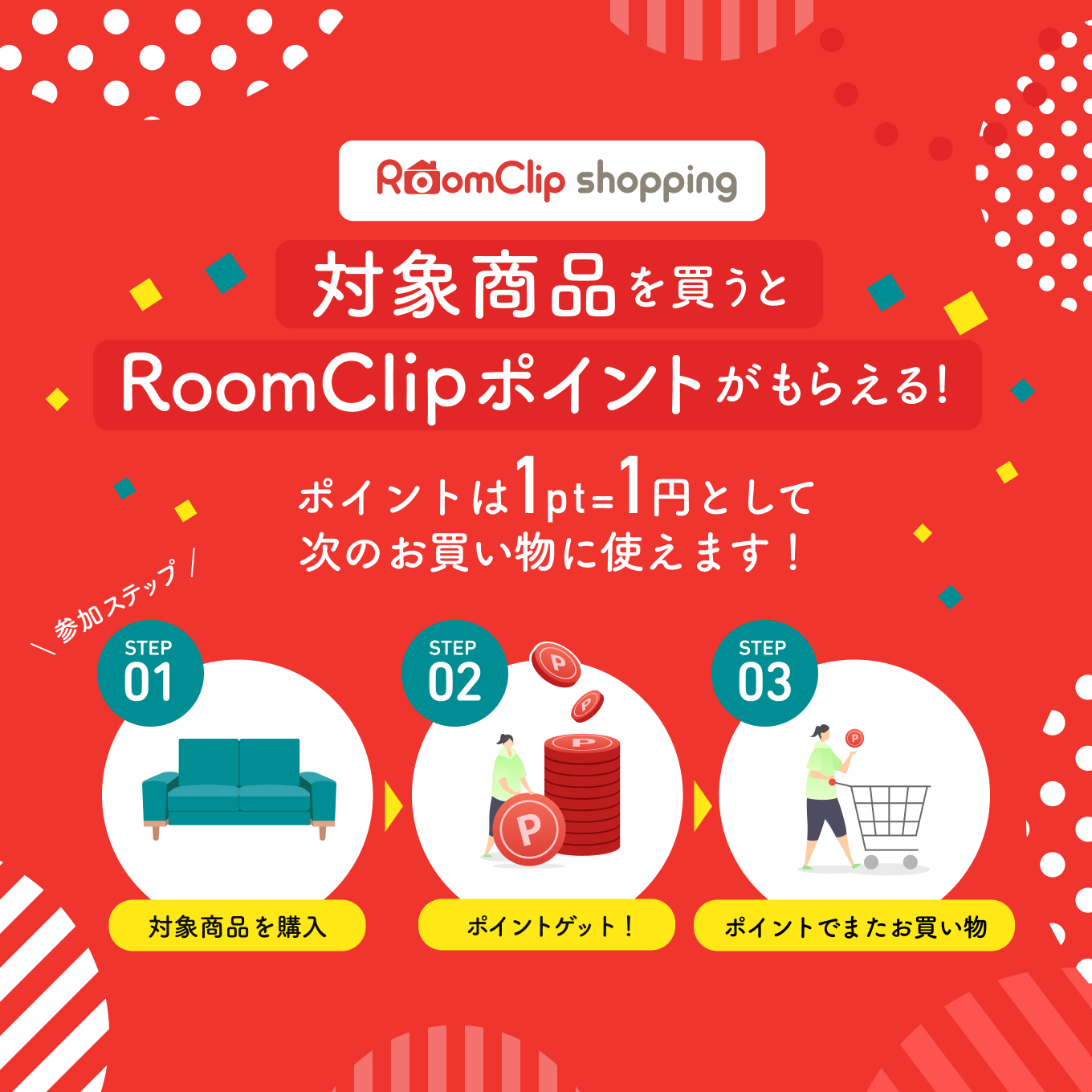 RoomClipショッピングでの商品購入時に、1ポイント=1円として利用できる、