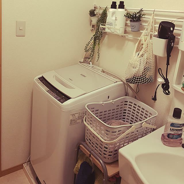 洗濯機にはタオル掛け&バスマット掛け&マグネット式の簡易ごみ箱を付けています。我が家では最後にお風呂に入った人がお風呂の排水溝に溜まった髪の毛を取って捨てるようにしてるので、すぐに捨てられる場所がほしくなり、でもちゃんとしたごみ箱だとそれ自体を洗う必要もあって面倒だなぁ…と検討した結果、このホルダーを活用することにしました◎タオル掛けとバスマット掛けは、セリアのアイアンバーにマグネットを接着して作ったものです♩