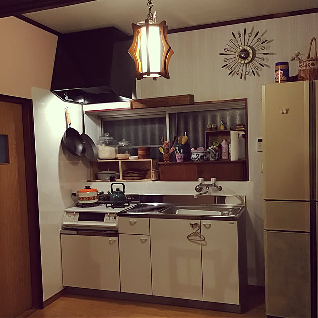 狭いキッチン。 冷蔵庫塗りかけ 笑 シンク下収納の扉は何色にしようかな。 アクメファニチャーのこの照明大好き💕