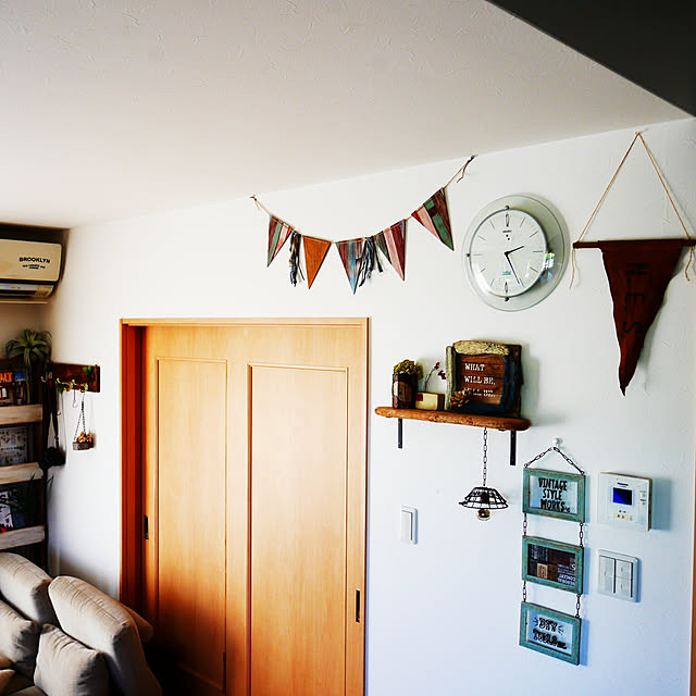 セリアのリメイクシートと ベニヤ板で ガーランドを作ってみました! ほんとはこれの4倍くらいの長さだったんだけど どうもうちのリビングには合わなくて。 そんなドタバタ劇もブログに書きました。 よかったら★ 裏はワトコオイルを塗って リバーシボーにしたよ♡ gamiさんのガーランドみたいに デニムとか括ってみた~