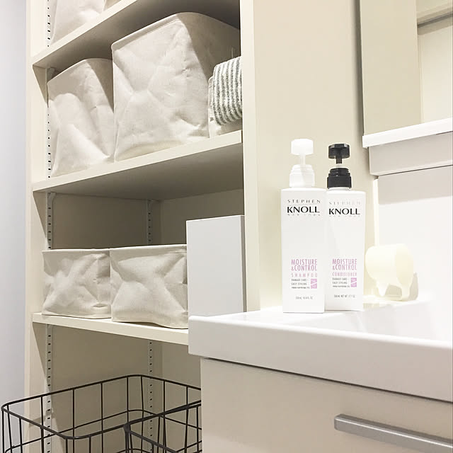 洗面台下は、プラ籠、ボックスからワイヤー籠にスタッキング出来るので、普段使わないストックの物、洗剤、