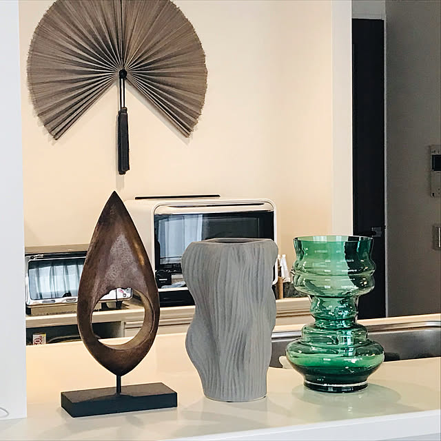 オブジェのような花器をキッチンカウンターに並べています