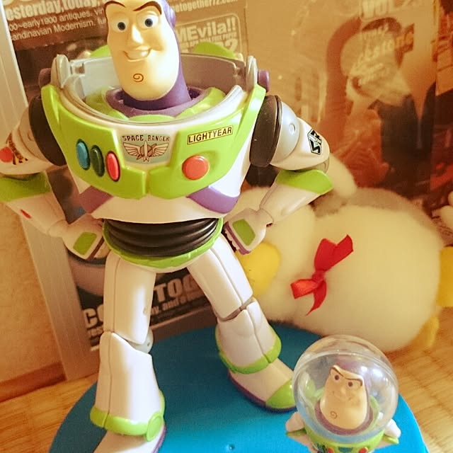 DIYした洋服掛けの上はあたしとツインズが大好きなカーズとトイストーリーのディスプレイコーナー(o´罒`o)♡右の壁が寂しかったので今流行りのセリアのリメイクシート6枚を貼りました❤️焼き網棚にはyuppeちゃんからもらったニコちゃん❤️mimi.ramiちゃんからのプラハンにはバズが入って飛んでます(o´罒`o)♡手作りした雲さんとの色味が一緒で可愛い〜❤️更にお気に入りコーナーになりました♡