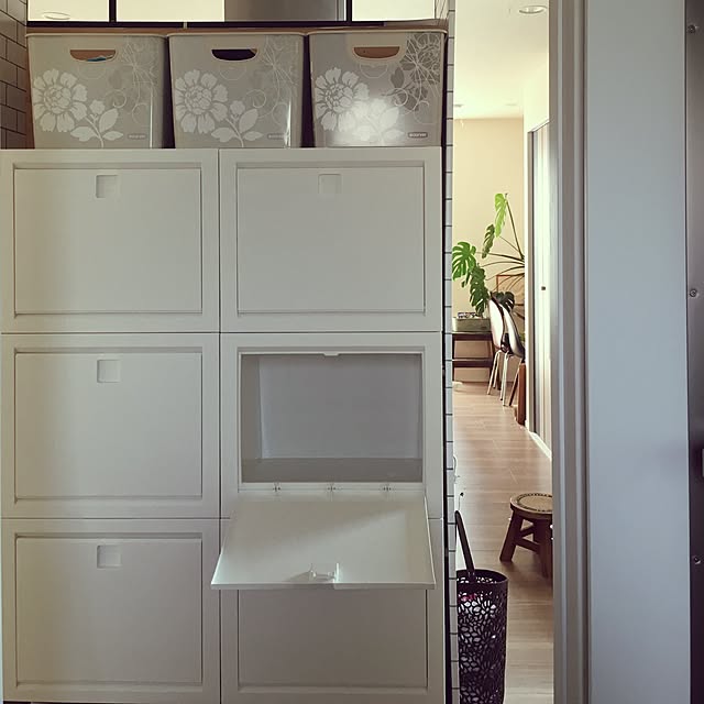 スマートフロアを見た時からキッチンで使わせて貰おうと決めていたのですが、左に見えているスマートフロアは、根菜入れに使っているIKEAのバスケットと調味料のストック入れに使っている無印のブリキBoxとの2つが載り、シンデレラフィットでした🥰 見えやすい様横向きにしています。 右は缶詰め🥫等の食品ストックが入った結構大きめのワインBoxです。 前から見ても横から見てもキャスターが見えません! 続く...