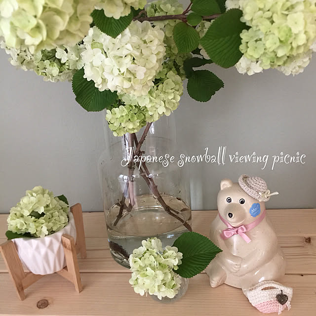 オオデマリの下でお花見ピクニックするシロクマさん❁❁ʕ•ᴥ•ʔ 可愛い帽子とカバンの編み編みはmayumiちゃんの作品です❤ mayumiちゃんのRCのお部屋 https://roomclip.jp/myroom/388205 mayumiちゃんのminneのお部屋 https://minne.com/@mayumi-mayu