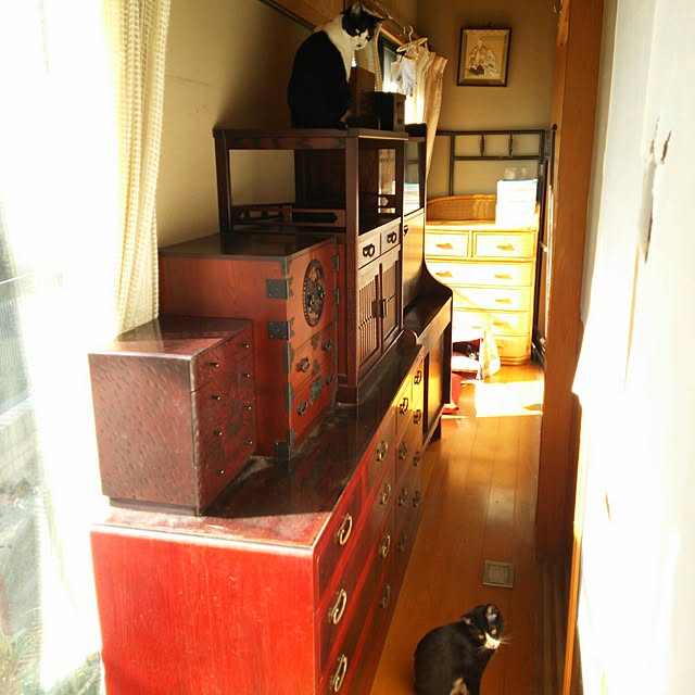 外が猛暑日の日は、サンルームから入る西陽をまず、サンルームのカーテンとシェードで遮り、縁側のカーテンで遮り、障子で遮る💪
