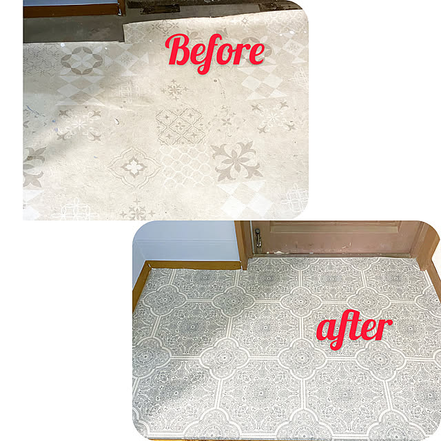 上がbefore、もともと貼ってあるグレーな石目調のもの。(汚れは目立たないものの、暗くてあんまり好きじゃなかったんです。。)そして下がafter!白っぽいタイル調にしました!あ、明るい〜!☺️