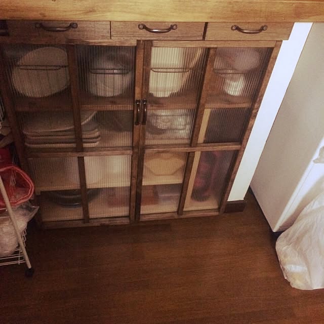 キッチンカウンター下の食器棚。 昔、お皿を置く場所が無くて間に合わせのように作ったこの棚を解体し、新たに作り直そうと思います👍 あんまり変わらないかもしれませんが😂