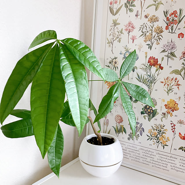 初投稿。 パキラ購入しました。 この場所は植物置く定位置になってます。この間までドウダンツツジ置いてました。 お花のパネルはSHEINで購入しました。 ※フレームはAmazon