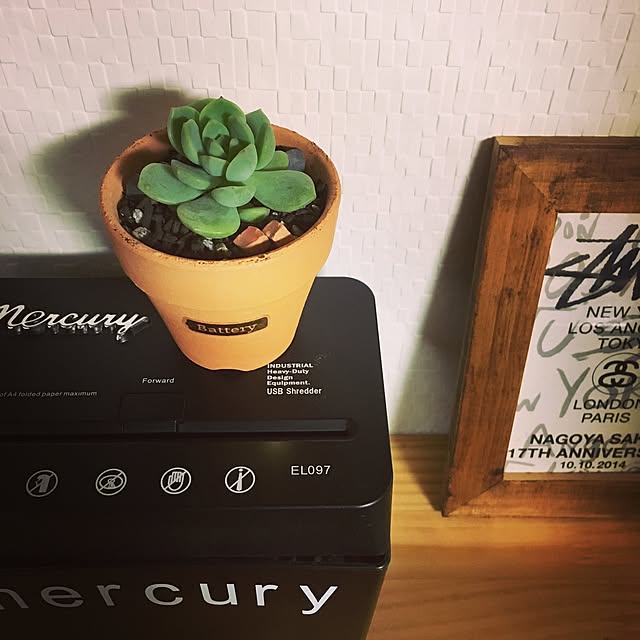 ミニ観葉植物や冬越しで入れた多肉も置いて、お友達のハンドメイドも♡