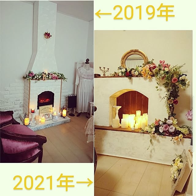 右上の写真は暖炉の内側に貼っているレンガ模様のシートもキッチンのコンロ周り用に作られた防炎シートを使用しています。
