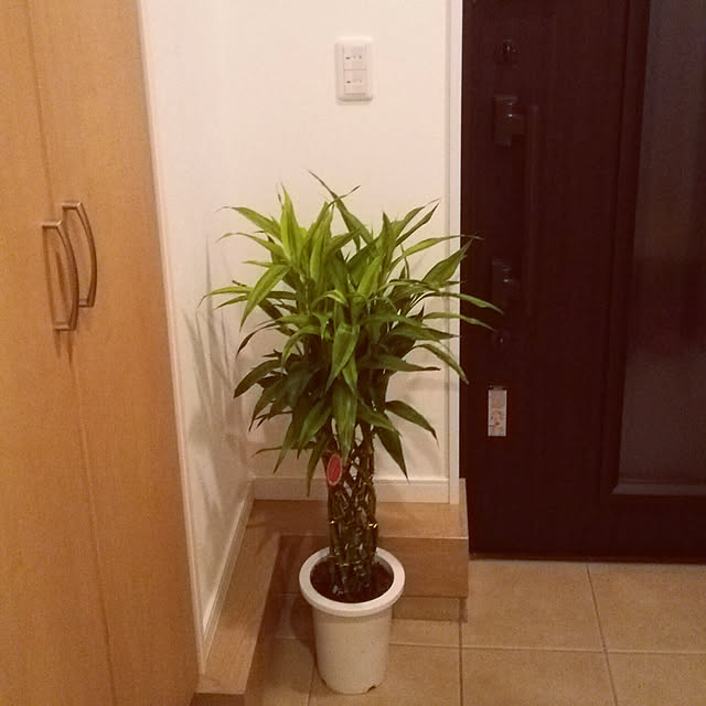 昨日買った受け皿がサイズ合わなく、まだ玄関に残留 している男前なドラセナサンデリアーナくん。 受け皿のサイズ採寸したのは...旦那&次男( ;∀;)