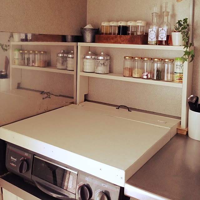 コンロ奥カバー?ラック?をDIYしました。 奥の油はねや汚れがずっと気になっていたけど、ガス栓の位置が高く市販のものは合う大きさのものがない…。 木材に防炎塗料を塗り、アルミシートを貼りました。 熱が心配だけど様子を見つつ使うことにしよう… 調味料も置けるようになって使いやすくなりました♪ オシャレなボトルに詰め替えたい〜〜