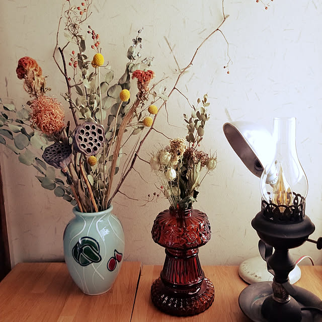 青い花瓶はリサイクルショップで出会いました。これは大好物!!ってなりました。赤い瓶の一輪挿しはヤフオクで500円!古いオイルランプのベースです。ホヤが欲しくて買ったのに こっちのほうが嬉しかった。